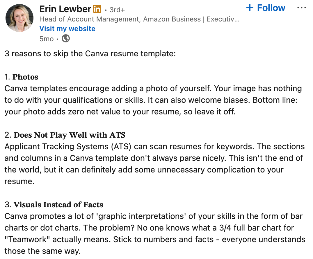 - You can create layouts that look fantastic, but often at the expense of clarity and hierarchy that hiring managers and ATS systems favor.