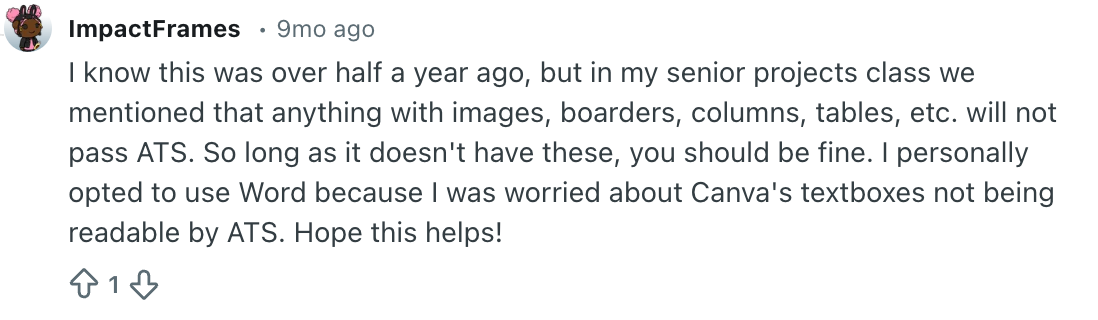 In Reddit communities like r/resumes, concerns about Canva typically center around formatting and ATS readability. Some users report improved response rates after switching from multi-column Canva templates to simpler, single-column formats.