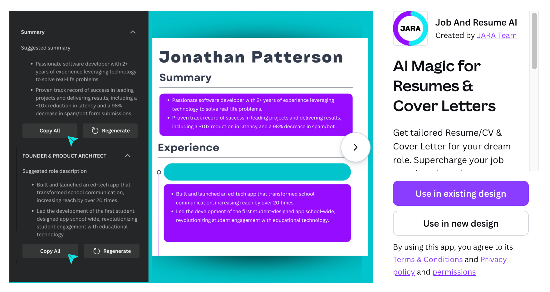 If you enter through the Job and Resume AI (JARA) app, the experience shifts from design to data. However, users should be wary: this is a third-party application. By using it, you’re bypassing Canva’s native resume-building experience in favor of an external developer's tool.