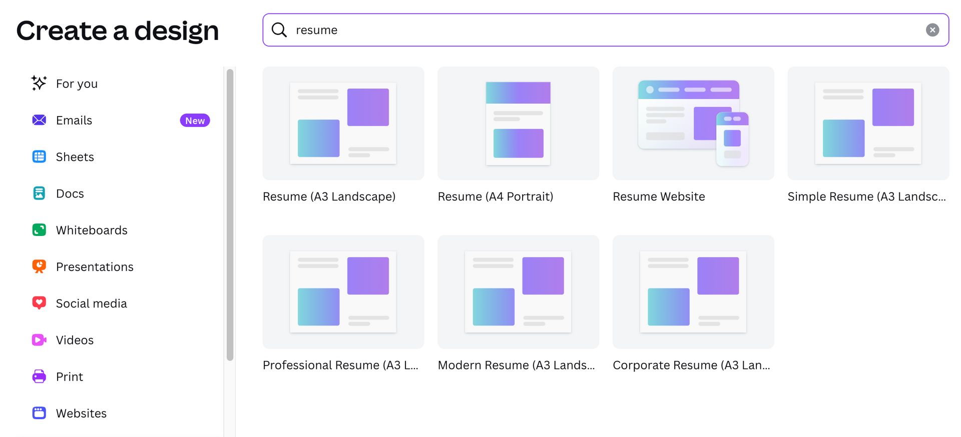 If you search for "Resume" on the Canva homepage, you get the classic experience: a wall of stunning, designer-made layouts.