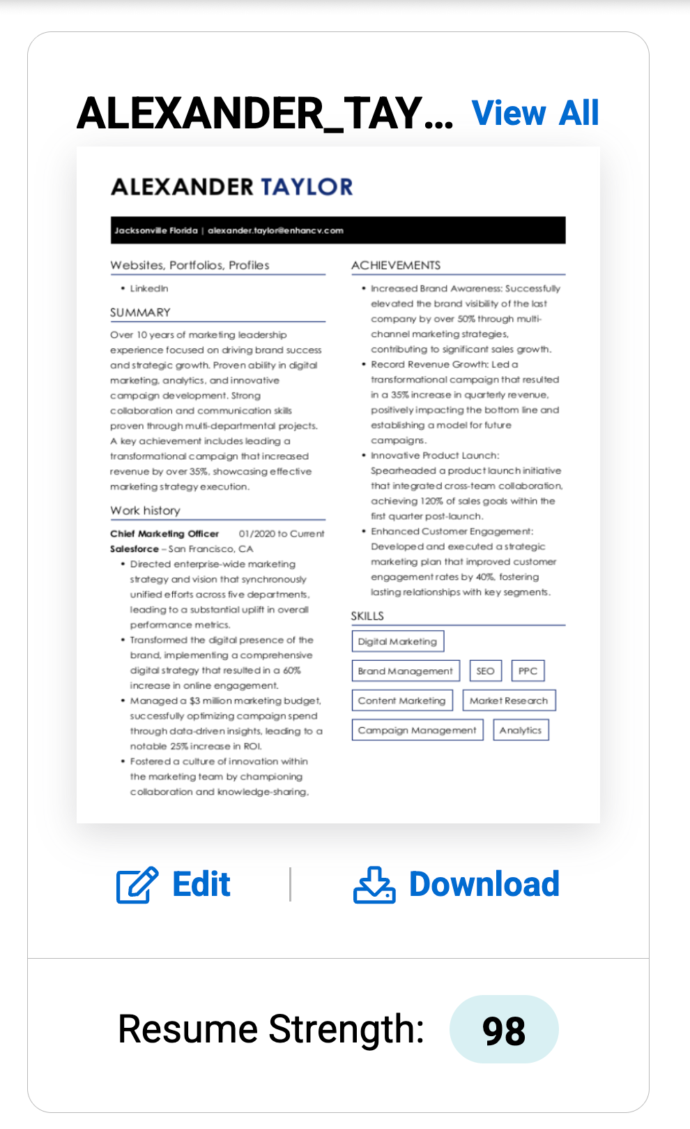 - Strength scoring: It gives your resume a numerical score (1-100) and provides real-time feedback on how to improve the relevance of your content.