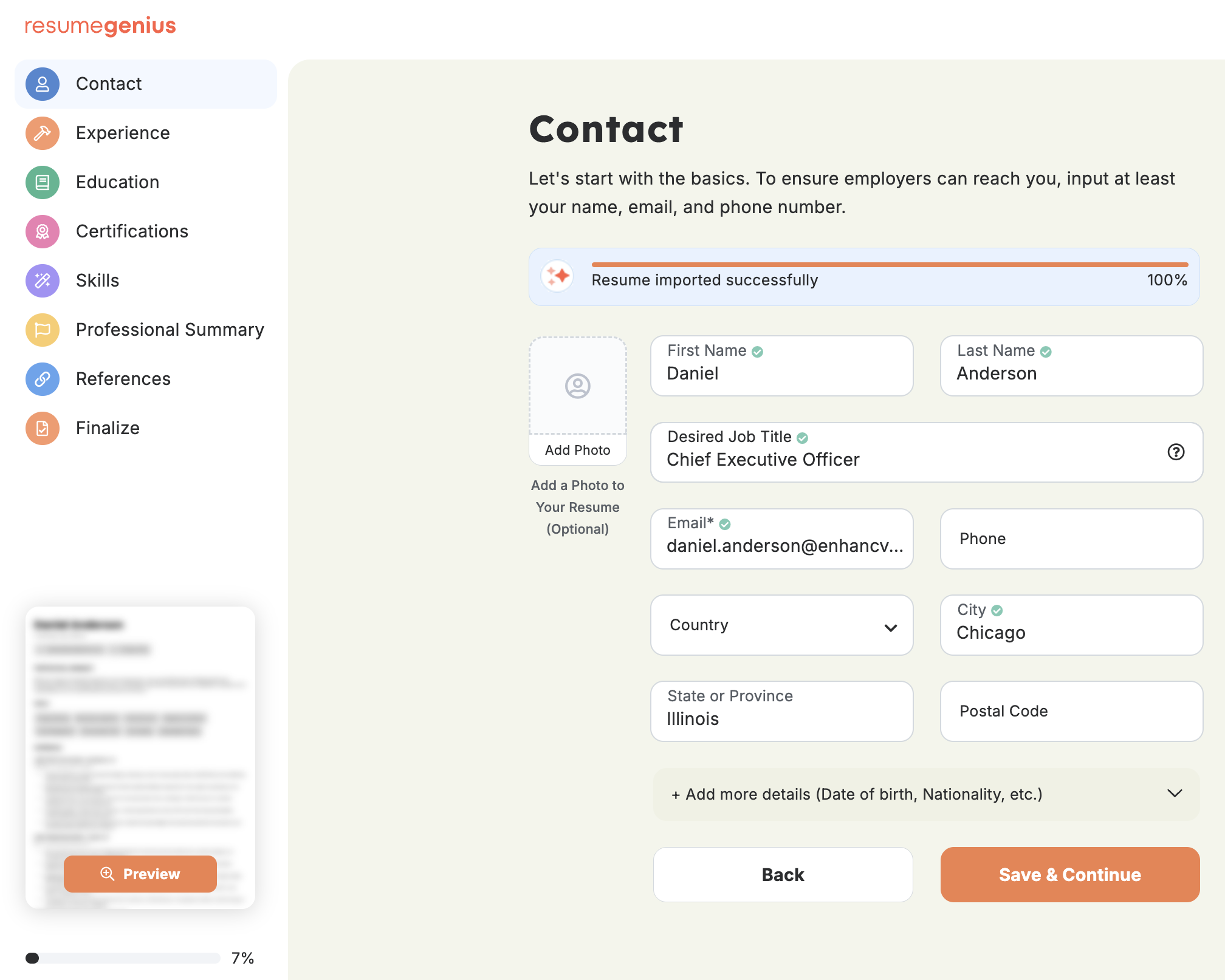 Resume Genius’ file upload and parsing are mostly reliable. Essential resume sections like Contact, Experience, Skills, and Achievements make it through the onboarding process. Still, some manual verification is necessary to make sure all your content is there.