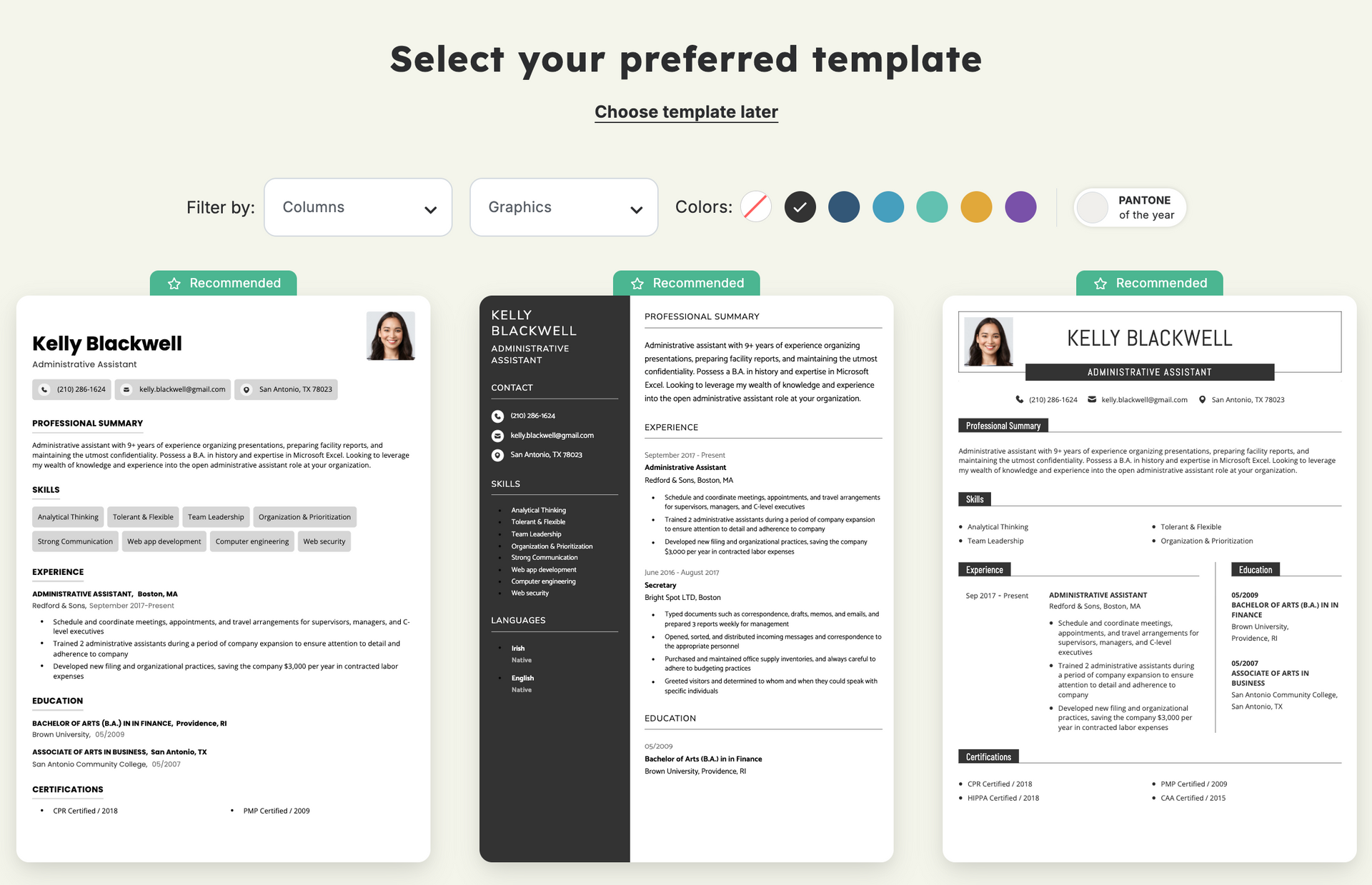 Moving on, I thought it would be interesting to test what would happen if I proceed with a single-column template (since I uploaded a two-column resume). I picked one of the recommended options.