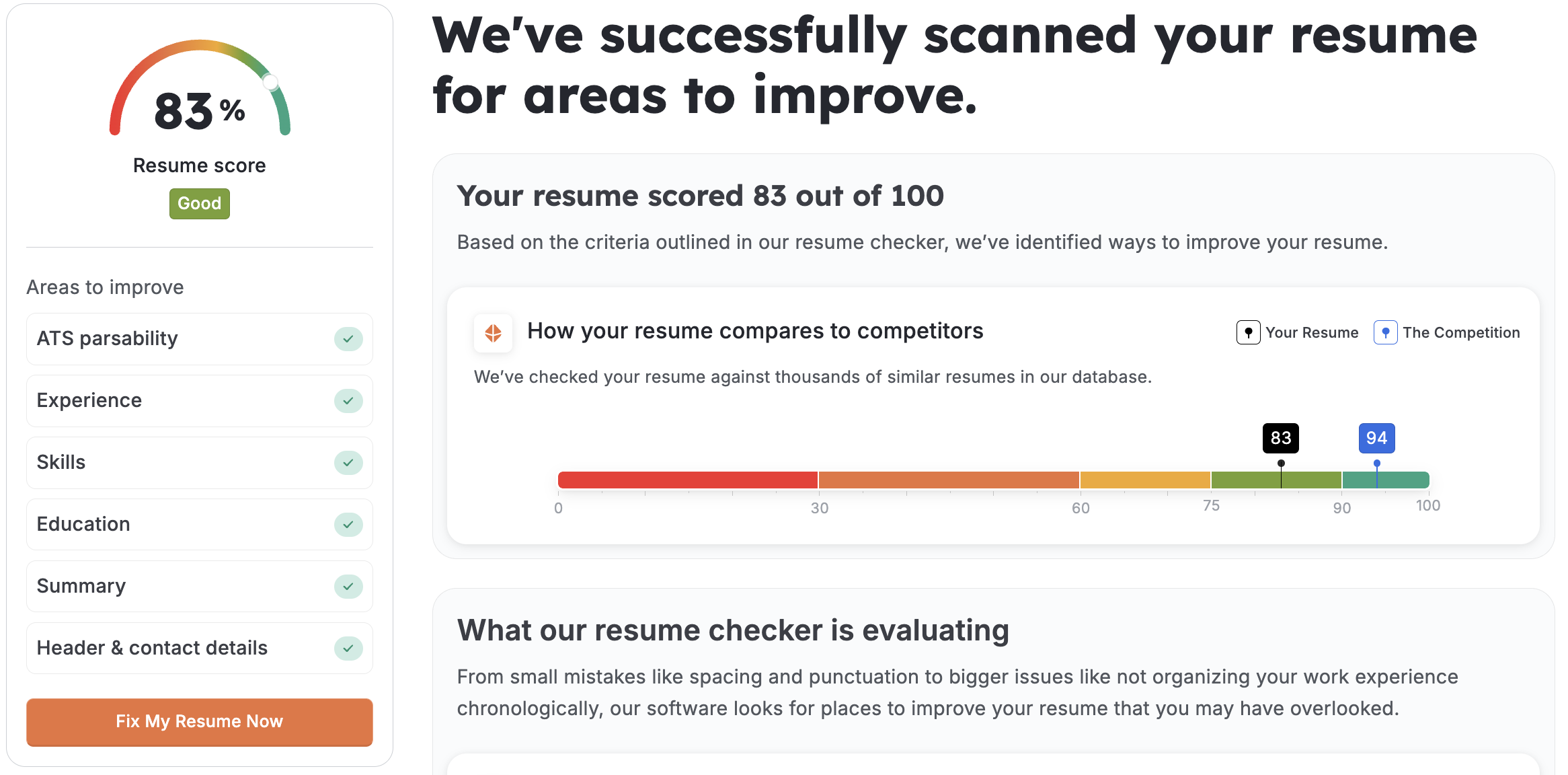 All “areas to improve” got a green checkmark but the verdict is 83 out of 100. The perfect score is but a mirage, yet I persevere in my journey for ATS approval.