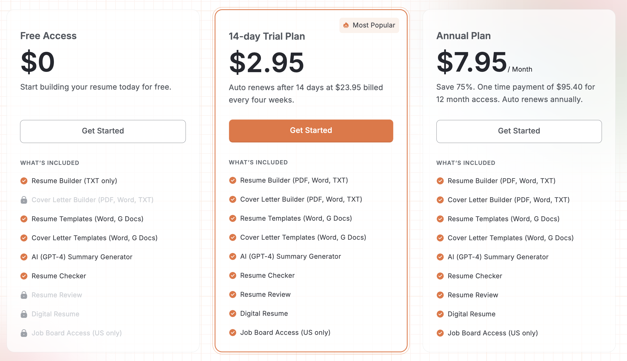 Be mindful of the 14-trial plan for $2.95 as it renews automatically. After that, Resume Genius bills you $23.95 every four weeks.
