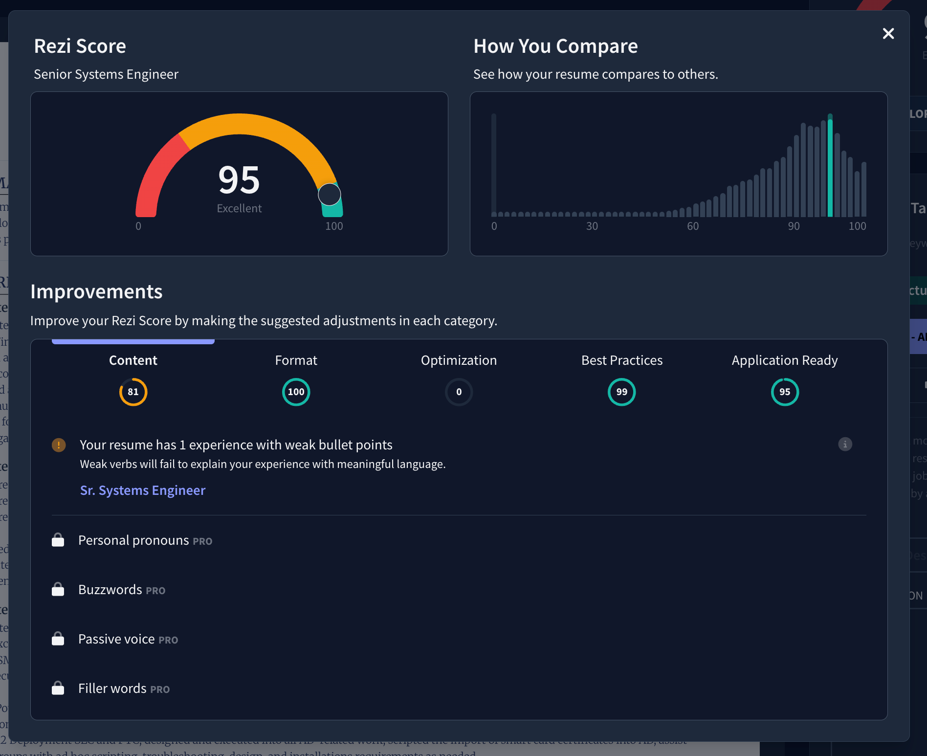 - The Rezi score: The real-time scoring system flagged "fluff" in my senior bullets, encouraging me to cut generic adjectives to save space.