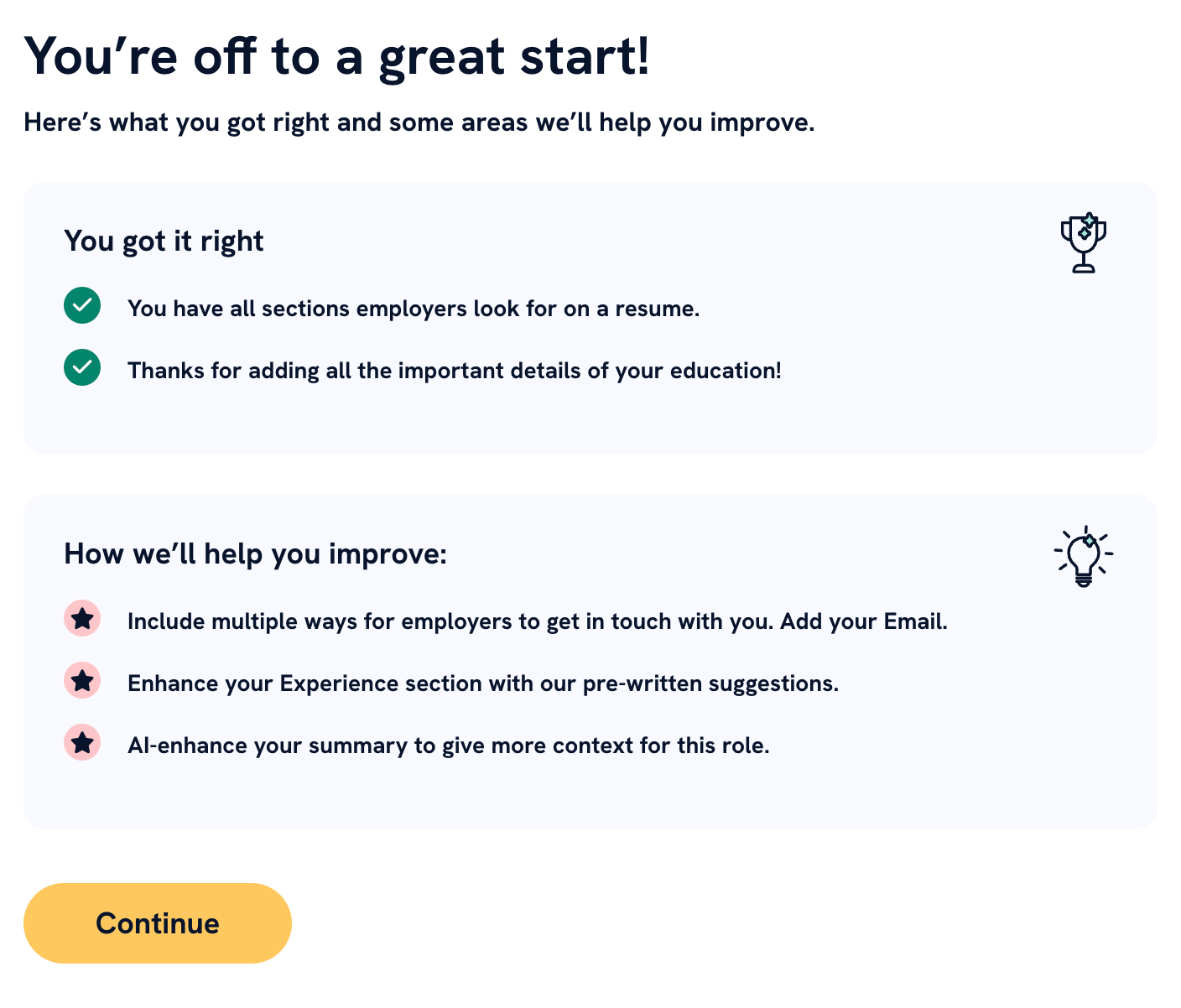 Next, the builder gave me “evaluative feedback”, listing what’s right in the resume and what needs to be improved.