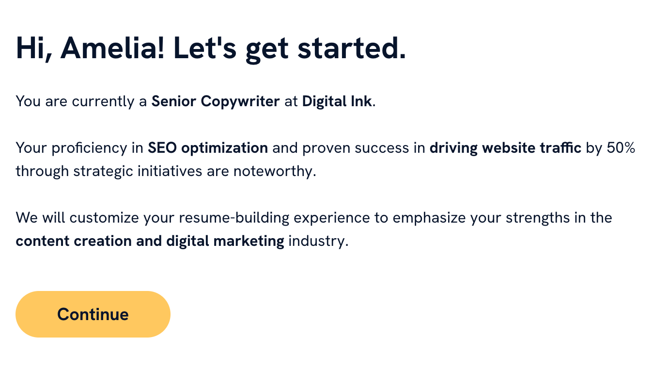 The cover letter building process is similar to the resume creation onboarding. The builder detected I’ve already created a resume so it gave me the option to import information from that document.