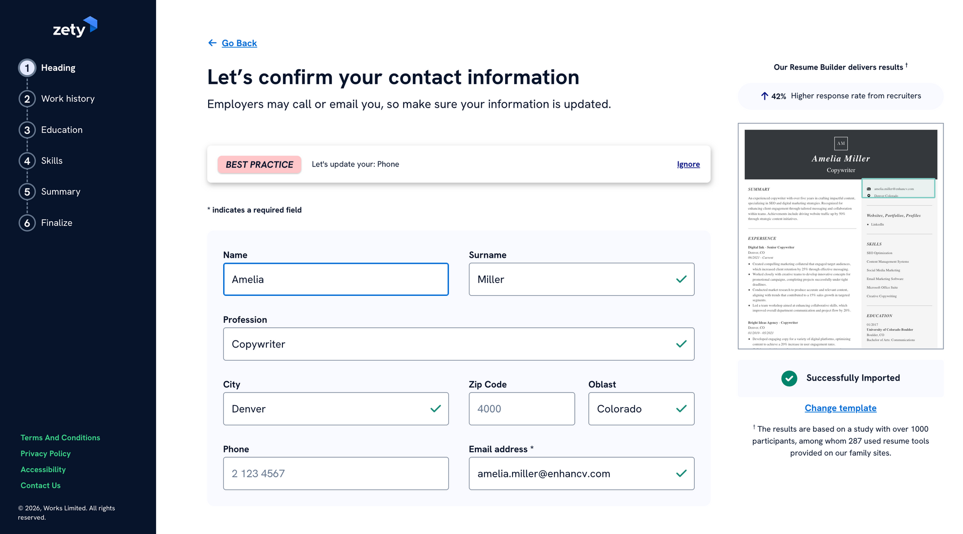 It looks like it wasn’t able to parse some of the information correctly. The resume I uploaded includes an email address and doesn’t have a phone number. The builder seems to think it’s the other way around.