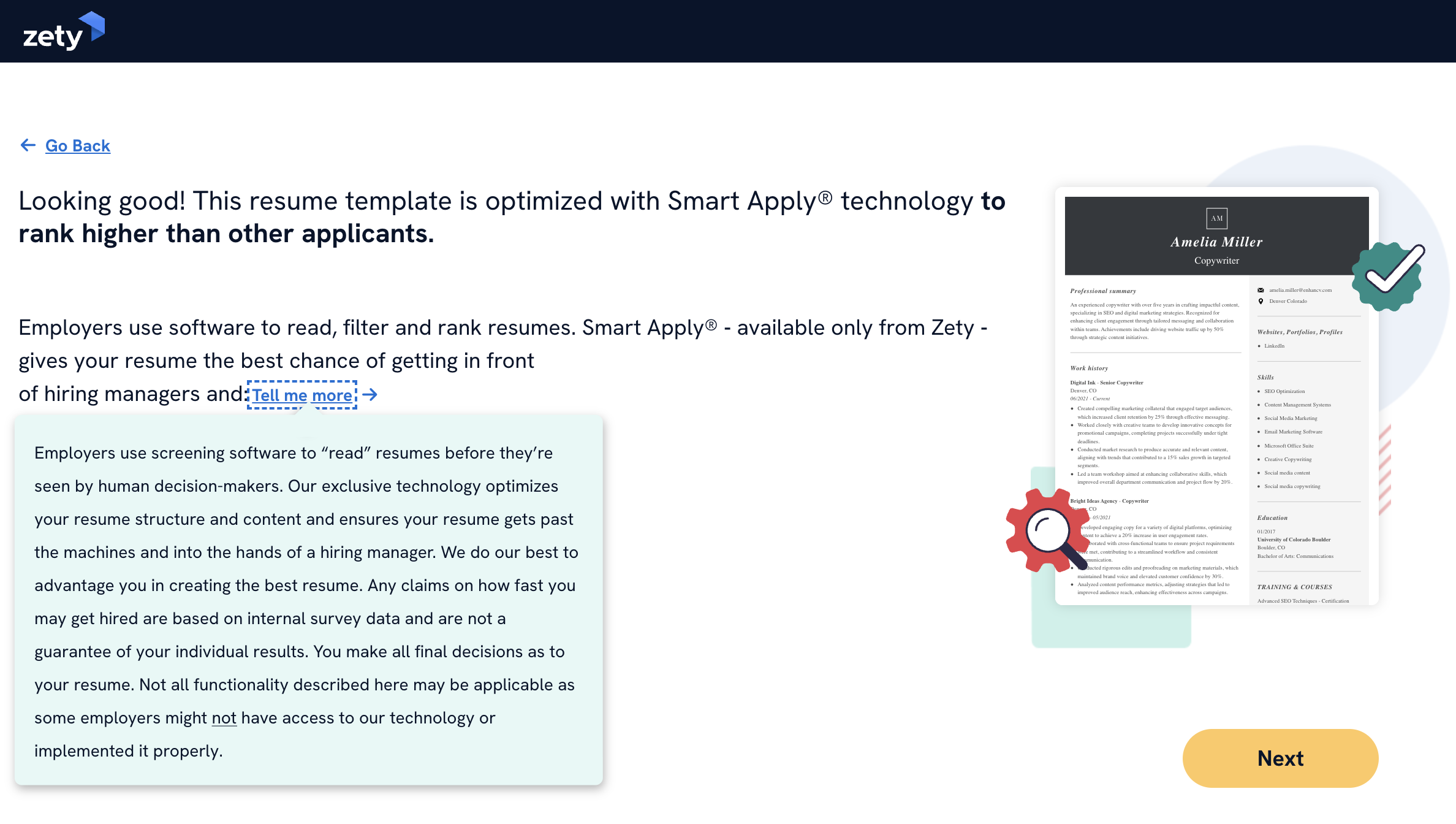 Zety says the resume template I’m using is optimized with something called “Smart Apply technology” and claims it will “rank higher than other applications”.