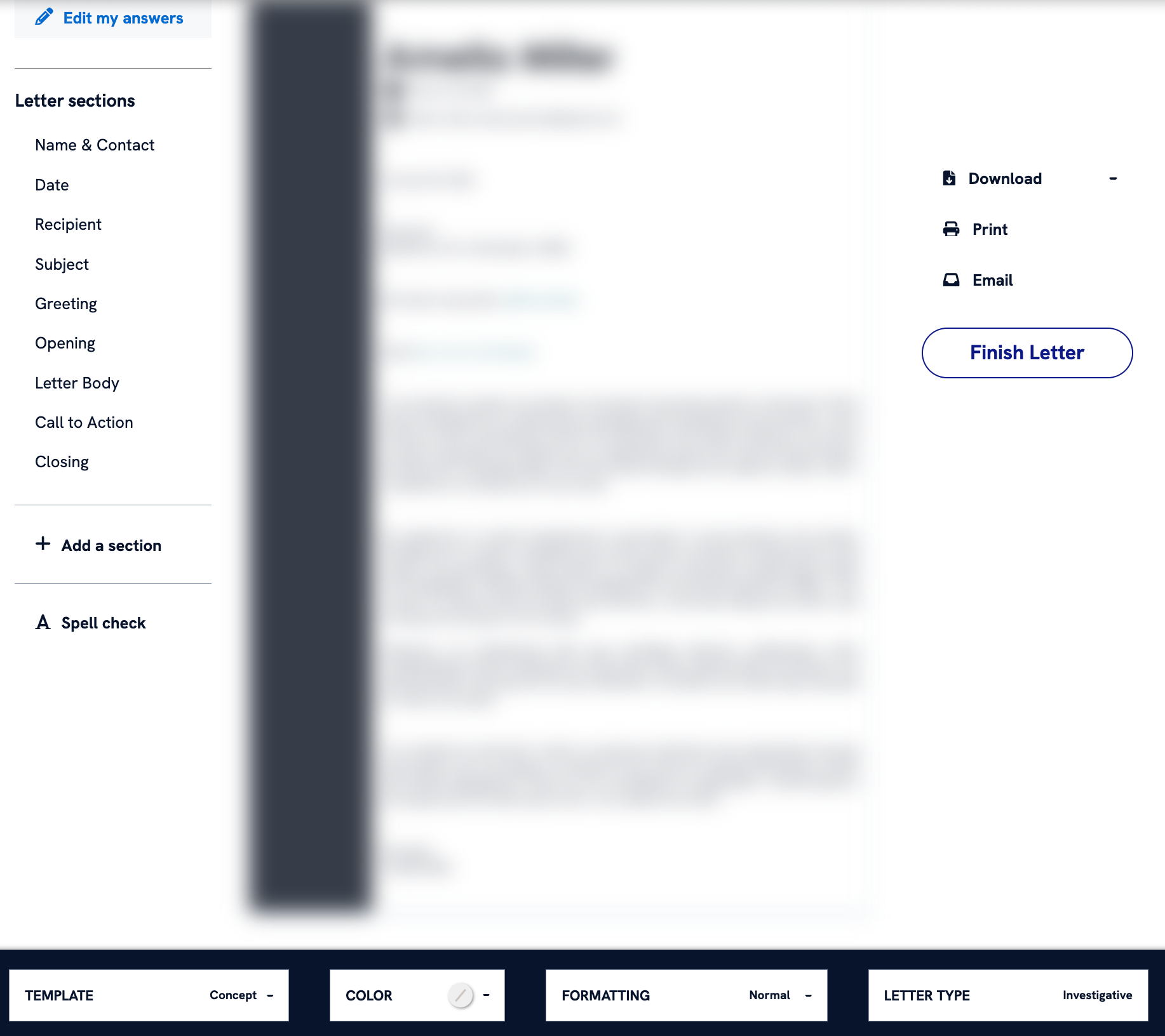 The result is a well-structured cover letter. (Sorry, once again, the content itself is blurred due to Zety’s built-in screenshot protection.)