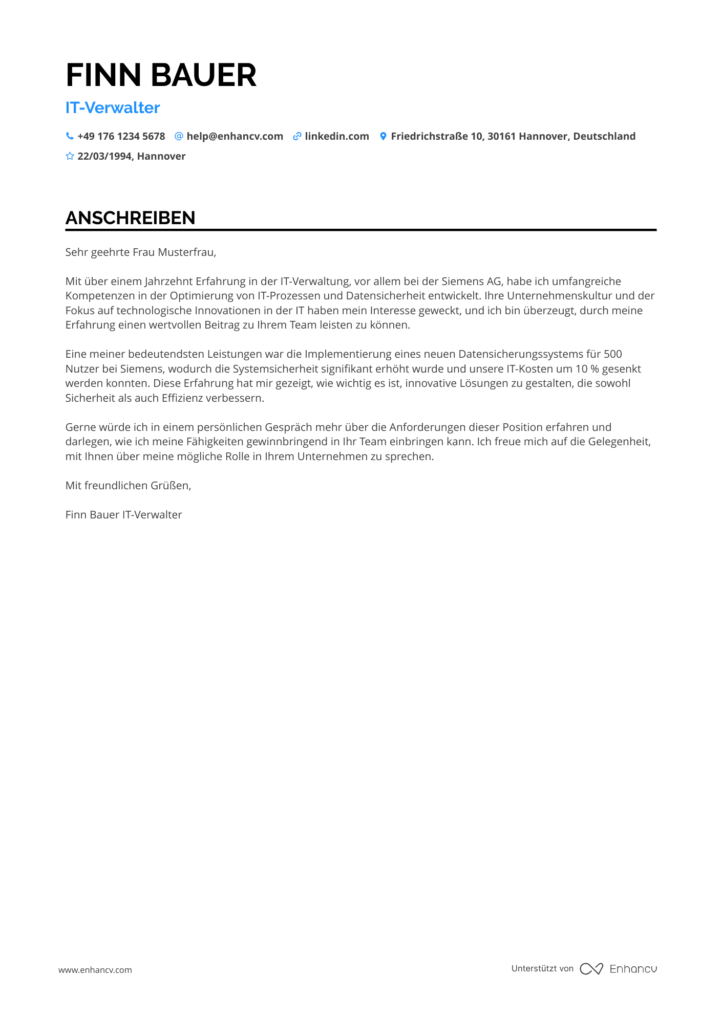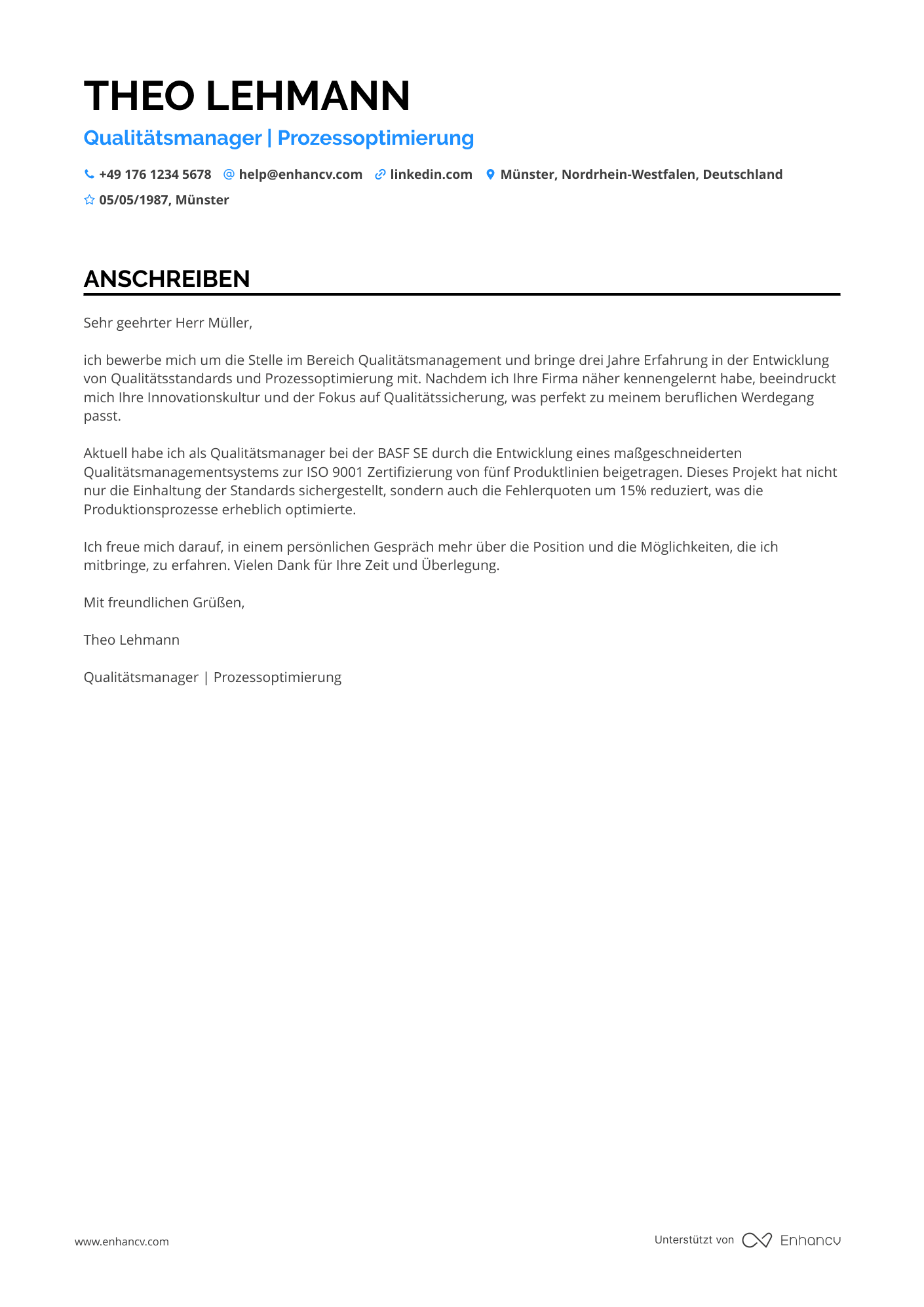 - Inhaltliche Klarheit und Struktur - Das Anschreiben ist klar und prägnant strukturiert, mit einer überzeugenden Einführung, die sofort die Aufmerksamkeit auf die Qualifikationen des Bewerbers lenkt. Jeder Abschnitt fließt logisch zum nächsten, wodurch ein harmonisches Leseerlebnis entsteht, das den Informationsgehalt maximiert.