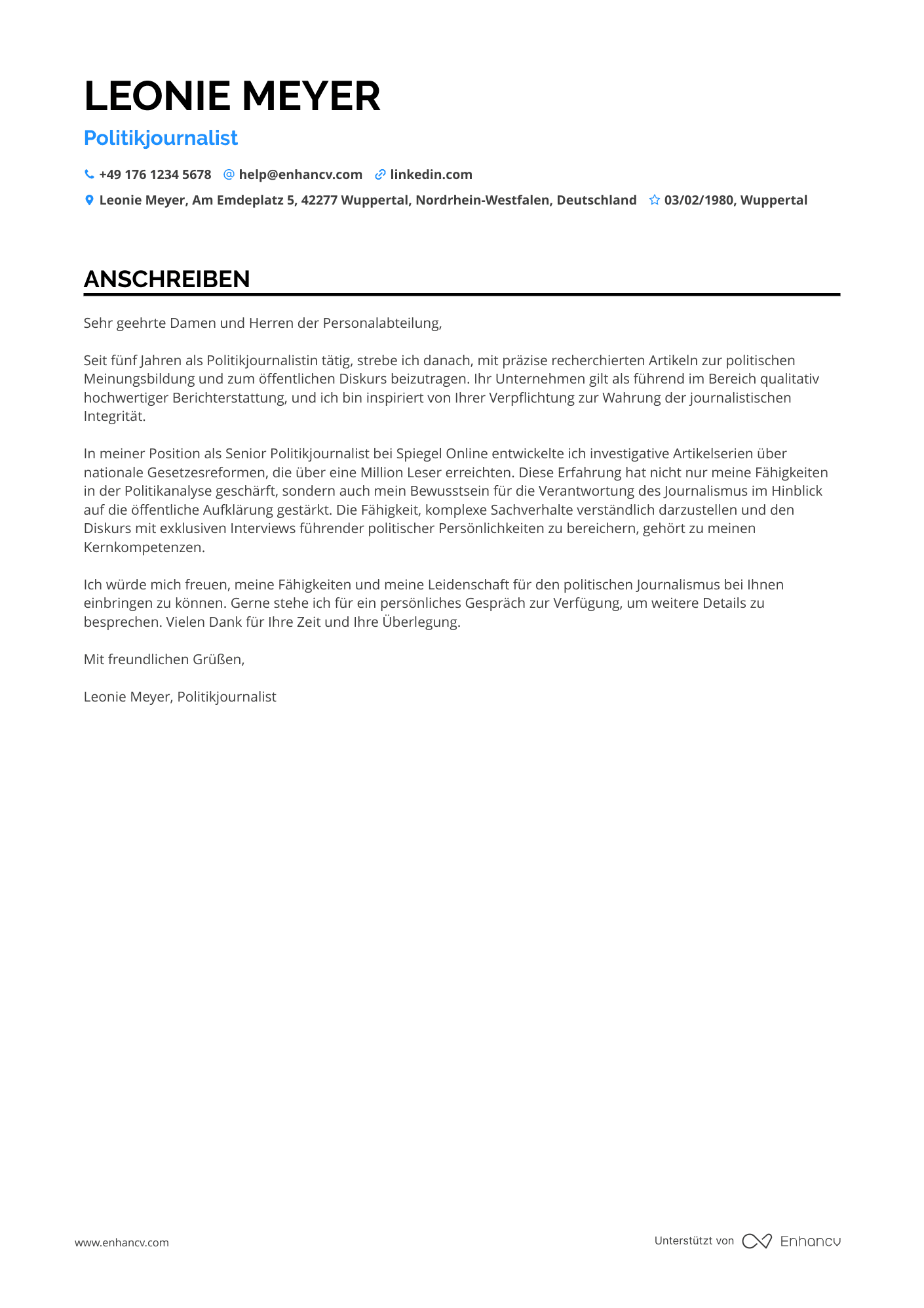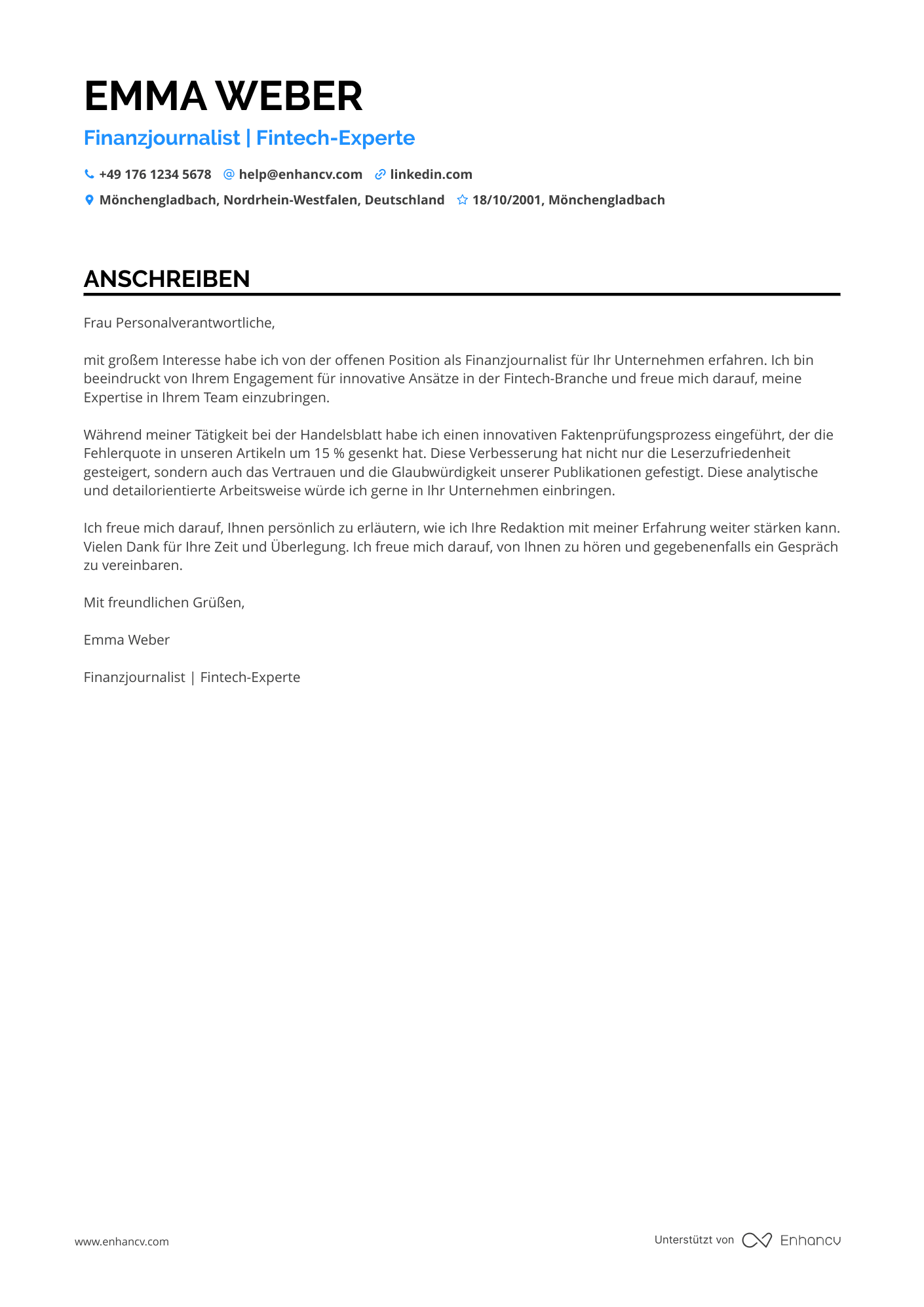 Eine der größten Herausforderungen bei einem Bewerbungsschreiben für Journalisten ist es, die eigene Vielseitigkeit und Anpassungsfähigkeit effektiv darzustellen. Unsere Bewerbungsschreiben-Beispiele helfen dir dabei, deine umfangreichen Fähigkeiten und Erfahrungen klar und überzeugend zu präsentieren. Entdecke die folgenden Beispiele, um das perfekte Anschreiben zu erstellen.