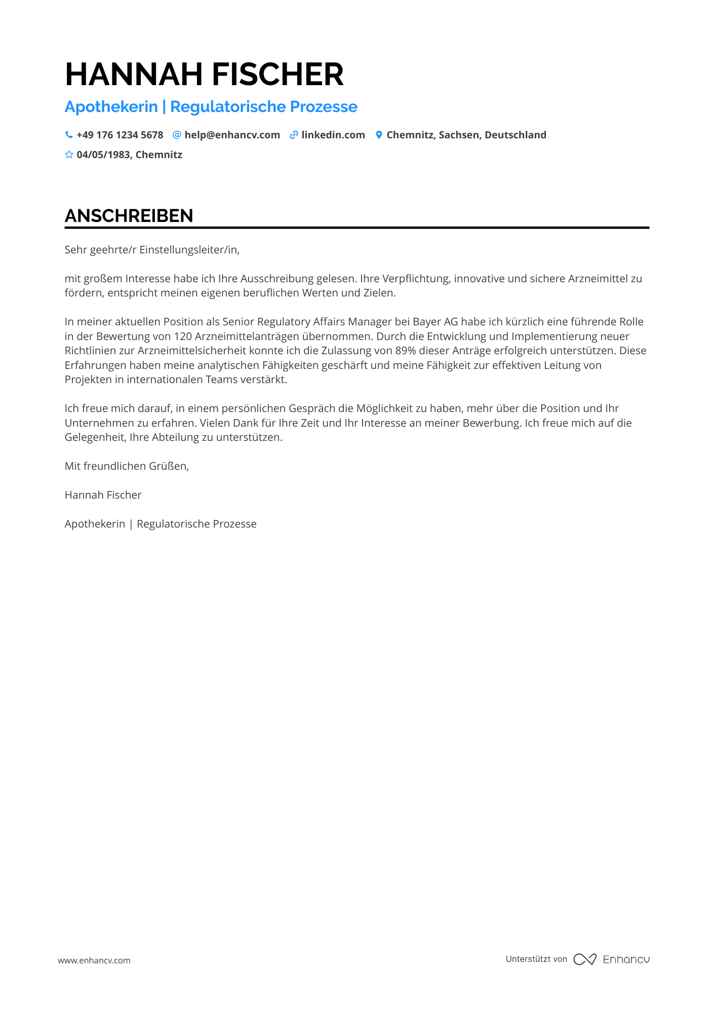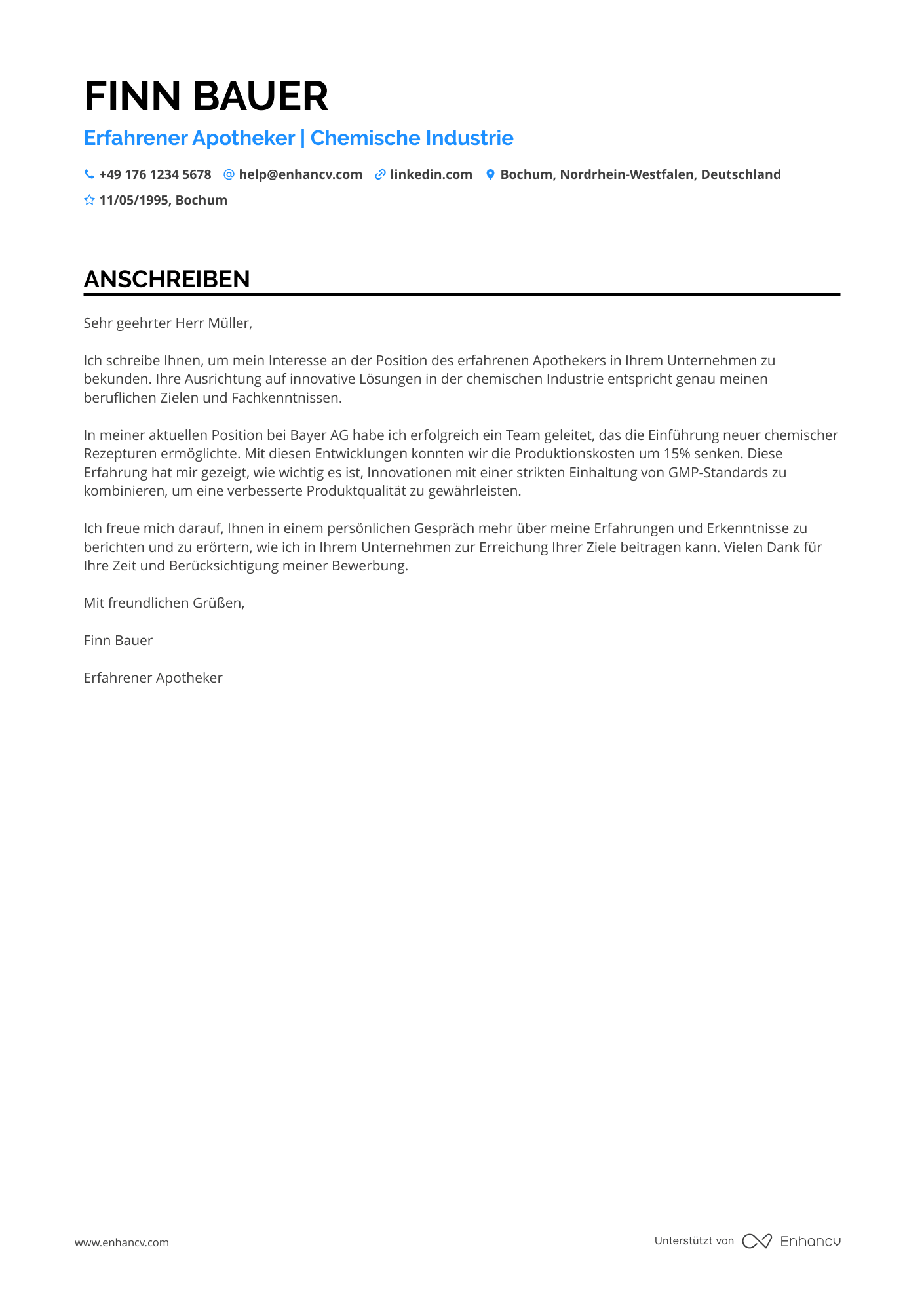 Eine häufige Herausforderung, der sich viele Apotheker bei Bewerbungsschreiben gegenübersehen, ist die individuelle Anpassung an verschiedene Arbeitgeber. Unsere Anschreiben-Beispiele helfen Ihnen, diese Schwierigkeit zu überwinden, indem sie Ihnen zeigen, wie Sie Ihre Qualifikationen und Erfahrungen gezielt hervorheben können. Schauen Sie sich die folgenden Beispiele an, um Inspiration und konkrete Formulierungshilfen zu erhalten.