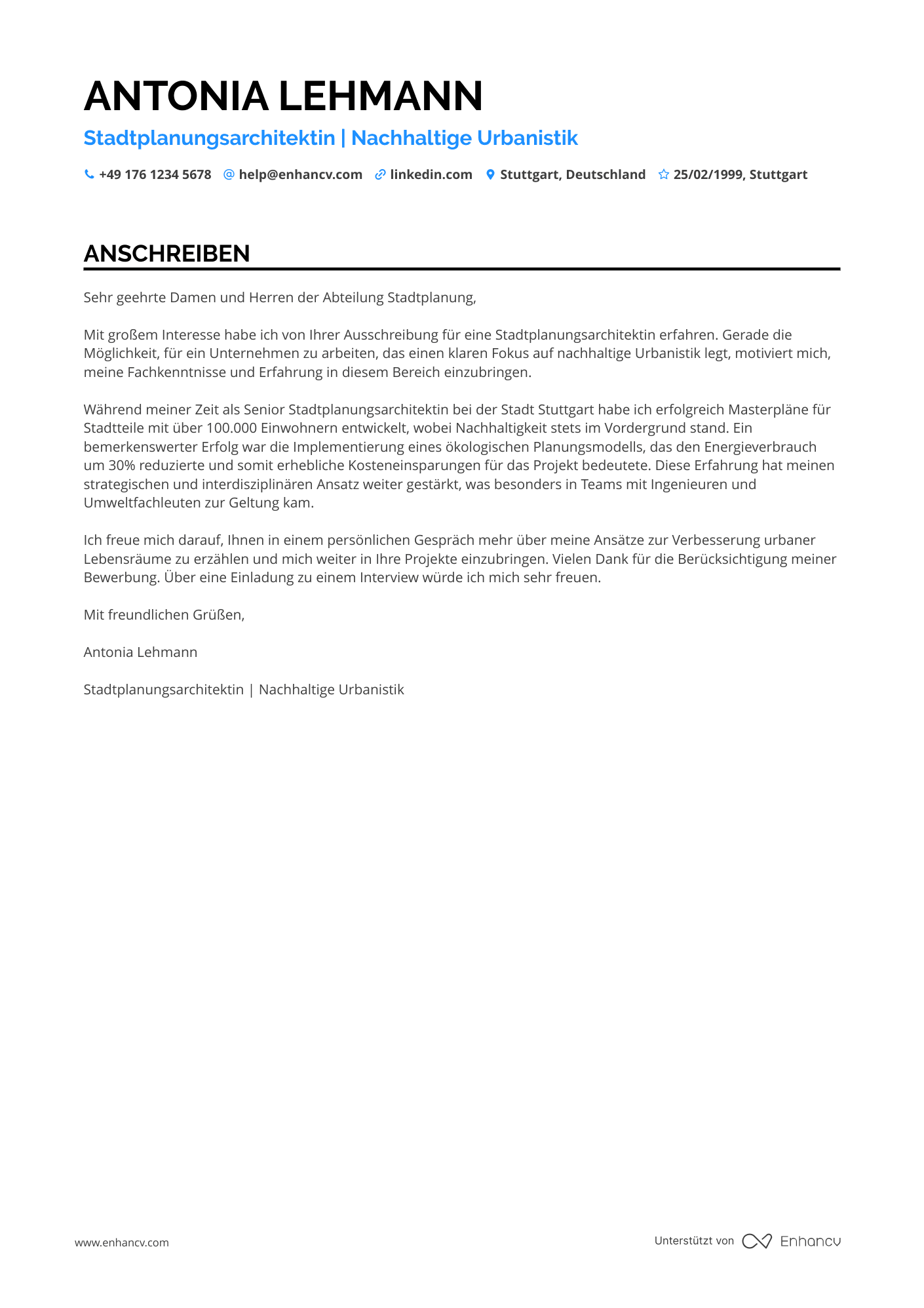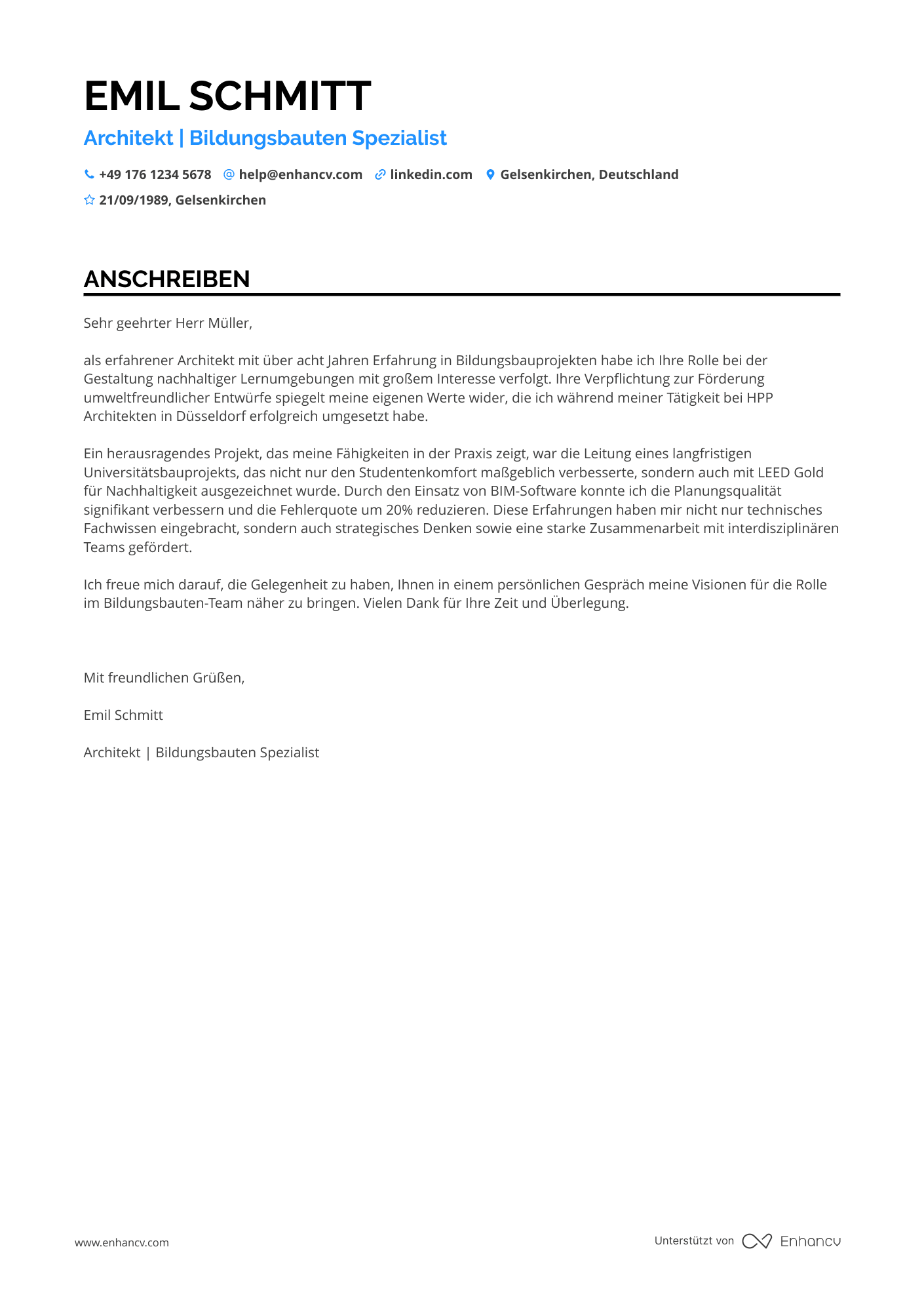 Ein häufiges Problem für Architekten beim Verfassen von Bewerbungsschreiben ist, ihre individuellen Projekte und kreativen Fähigkeiten überzeugend darzustellen. Unsere Bewerbungsschreiben-Beispiele helfen Ihnen, diese Herausforderung zu meistern, indem sie bewährte Formulierungen und Strukturen bieten, die Ihre Einzigartigkeit hervorheben. Entdecken Sie die nachfolgenden Beispiele, um Inspiration und Unterstützung zu finden.