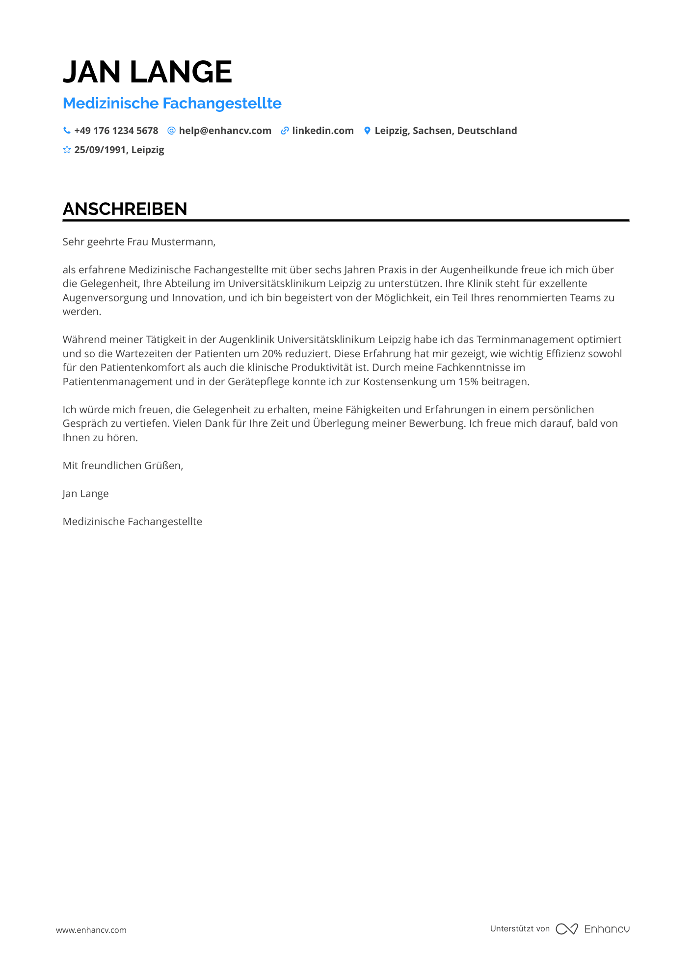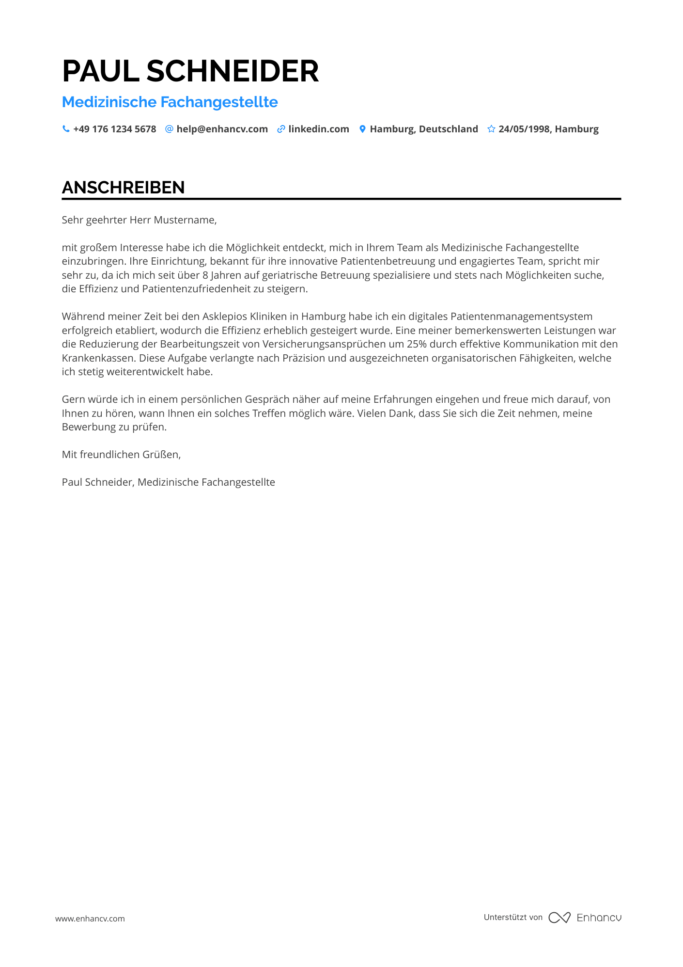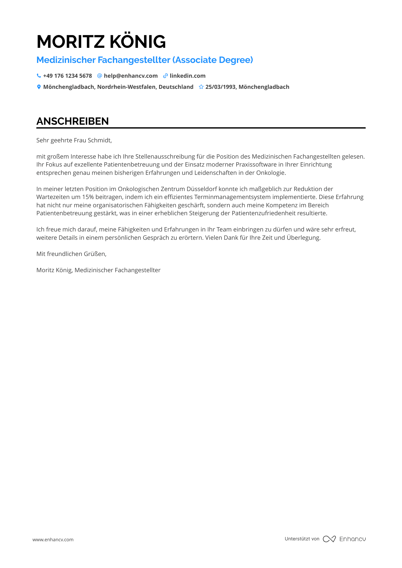 - Klarheit und Struktur - Das Anschreiben beeindruckt durch seine klare und logische Struktur, indem es die wichtigsten Informationen prägnant präsentiert. Jeder Abschnitt geht reibungslos in den nächsten über und macht es einfach, dem roten Faden zu folgen, was dem Leser sofortige Klarheit über die Qualifikationen des Bewerbers gibt.