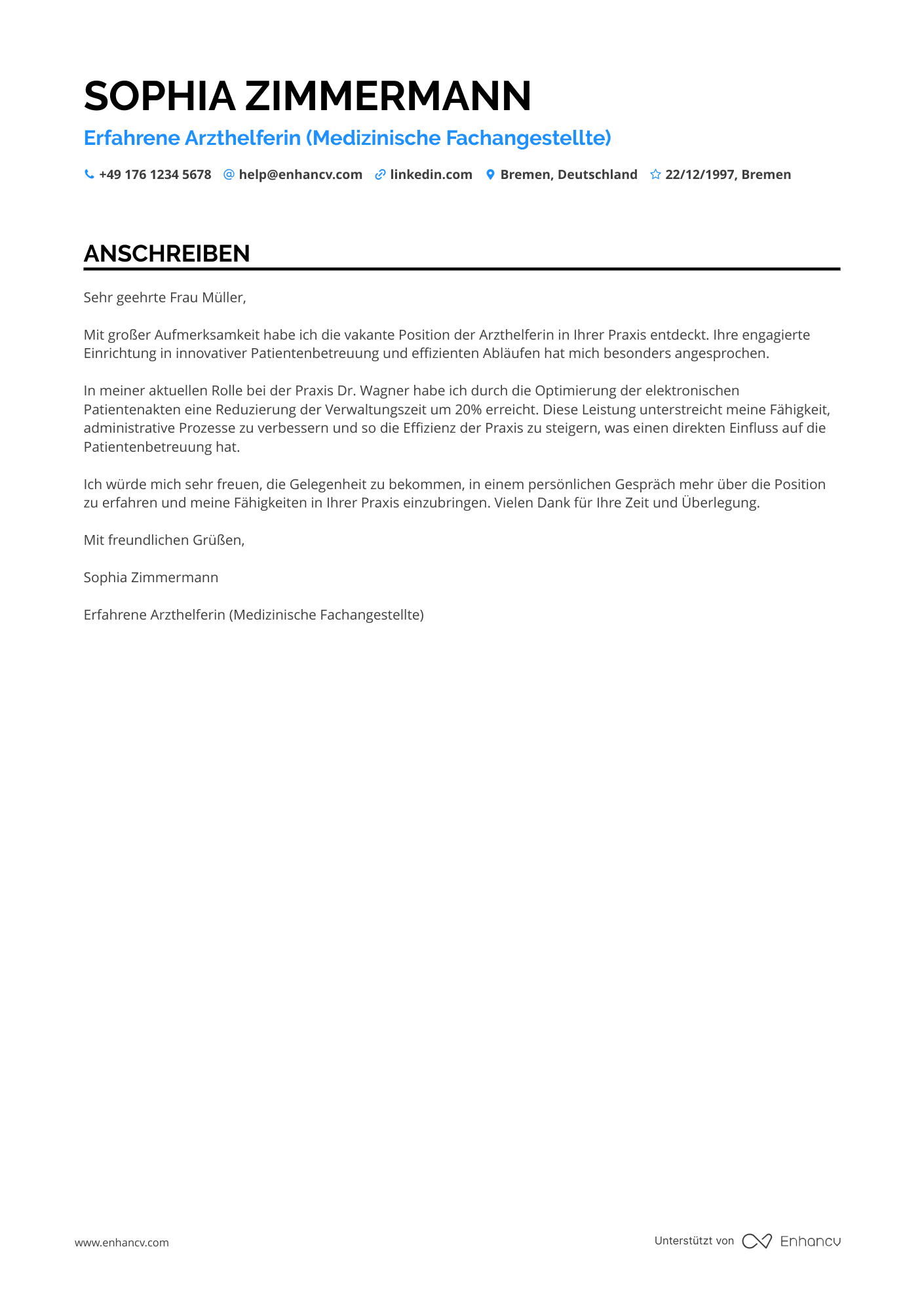 Eine häufige Herausforderung beim Verfassen eines Anschreibens für Arzthelferinnen ist die überzeugende Darstellung von Soft Skills. Unsere Anschreibebeispiele helfen Ihnen dabei, diese Herausforderung zu meistern, indem sie konkrete Formulierungen für die Präsentation Ihrer zwischenmenschlichen Fähigkeiten bieten. Sehen Sie sich die folgenden Beispiele an, um direkt loszulegen.