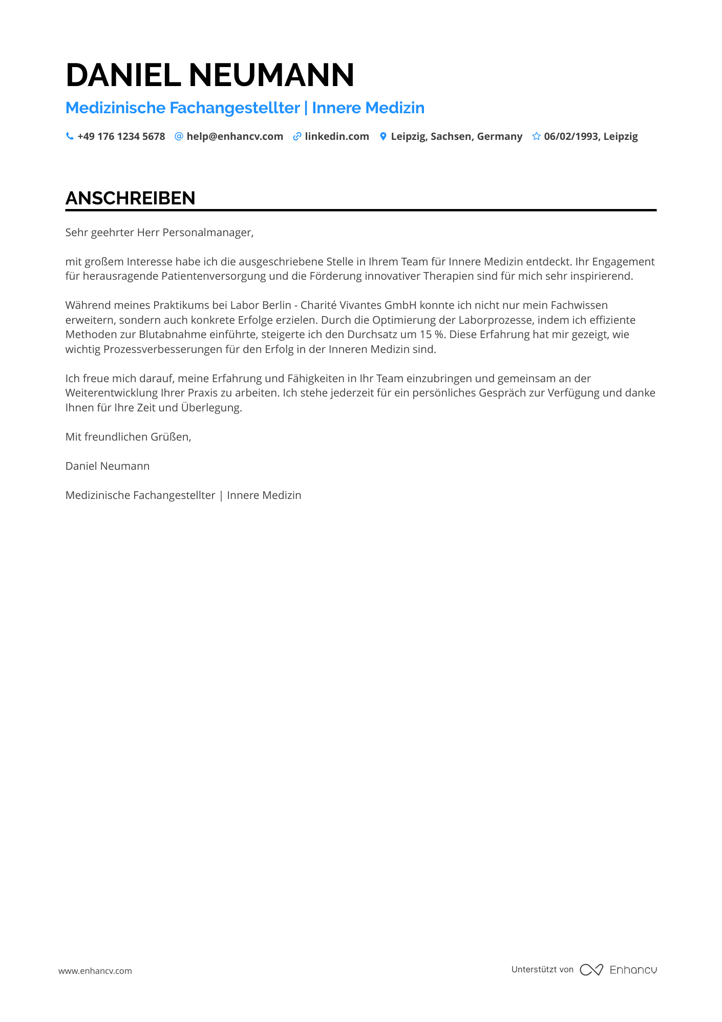 - Inhaltspräsentation - Der klare und strukturierte Aufbau des Anschreibens stellt sicher, dass der Leser sofort die wichtigsten Informationen erfasst. Jede Sektion ist prägnant und direkt auf die Anforderungen der beworbenen Stelle abgestimmt, was die Relevanz und Wirksamkeit des Schreibens erhöht.