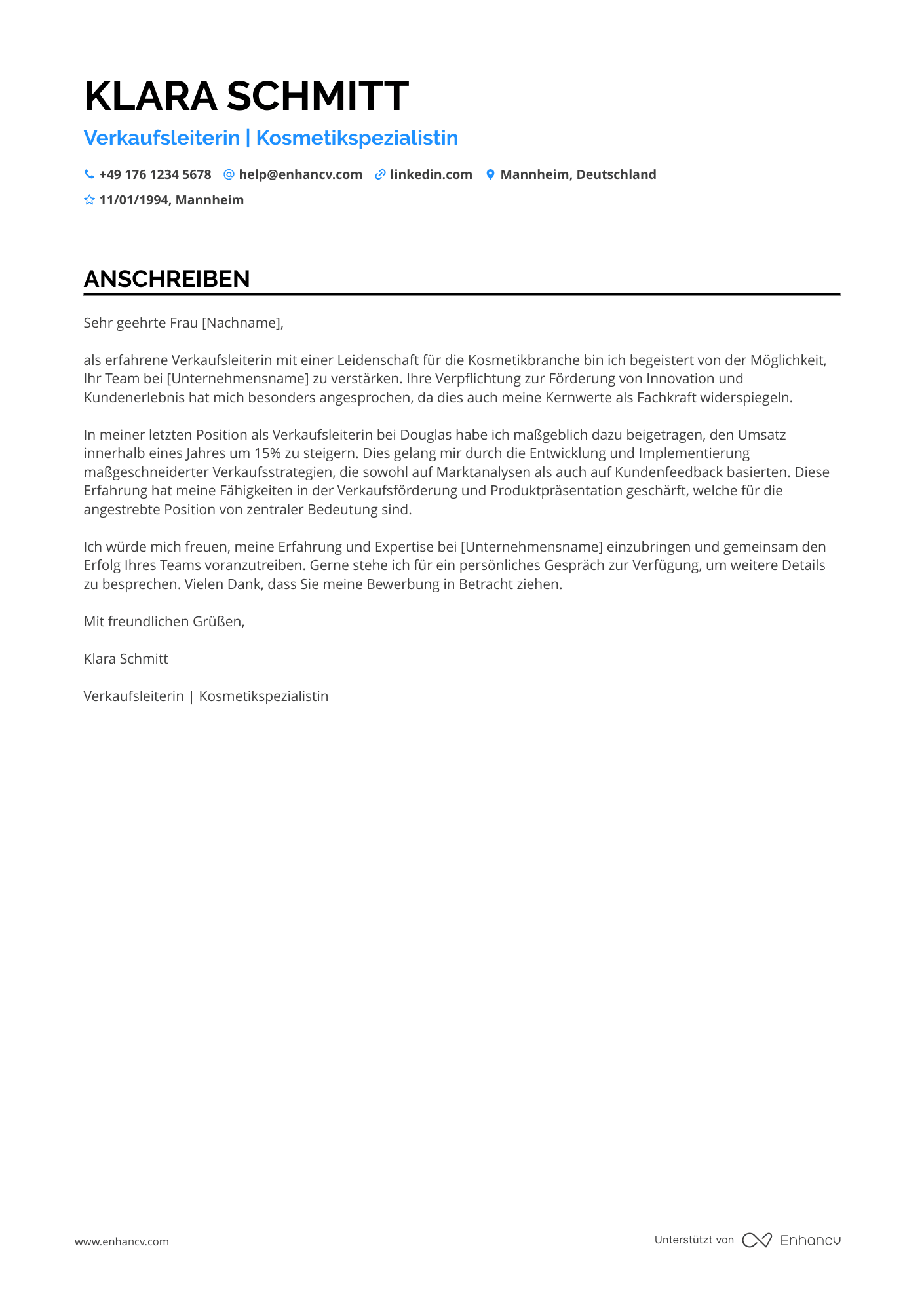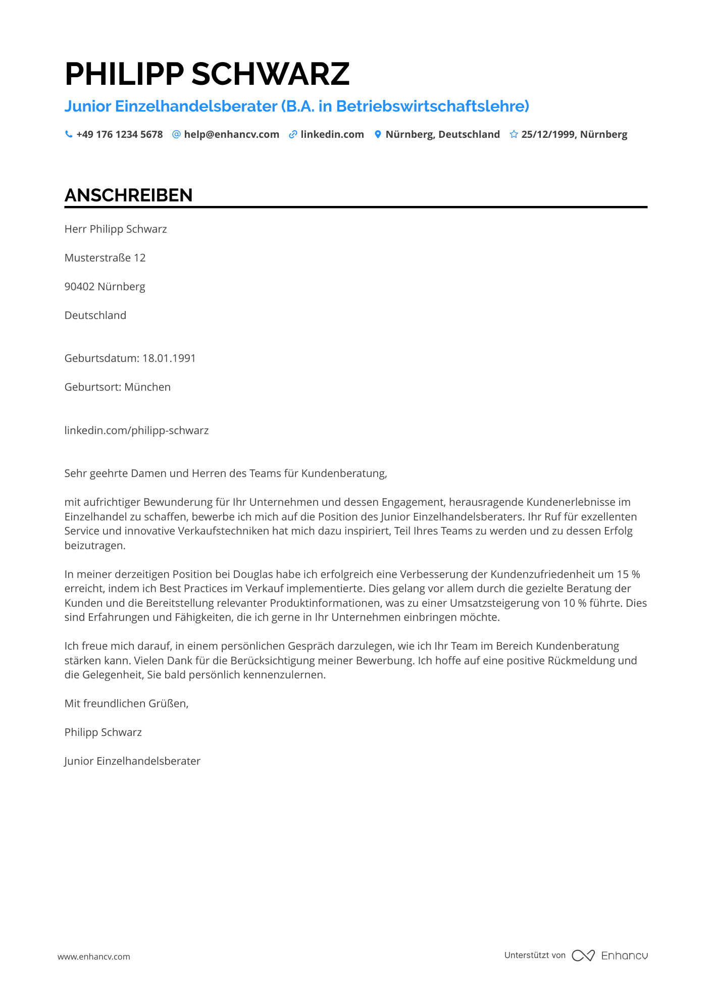 Ein häufiges Problem im Einzelhandel ist es, die richtige Balance zwischen Fachkenntnis und Kundenorientierung im Bewerbungsschreiben darzustellen. Unsere Anschreiben-Beispiele helfen dir, diesen Balanceakt erfolgreich zu meistern und bei potenziellen Arbeitgebern einen bleibenden Eindruck zu hinterlassen. Entdecke die praktischen Vorlagen unten, die dir den Weg zu einem überzeugenden Anschreiben ebnen.