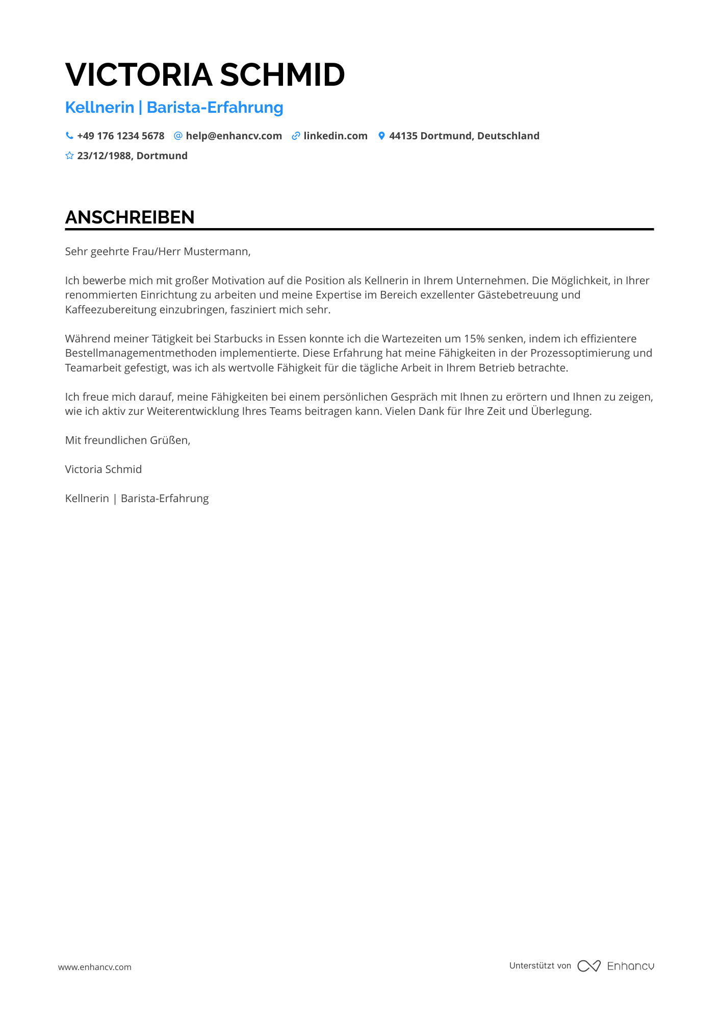 Eines der häufigsten Probleme bei einem Bewerbungsschreiben als Kellner ist die Darstellung relevanter Erfahrung, insbesondere in einem überfüllten Lebenslauf. Unsere Bewerbungsschreiben-Beispiele helfen Ihnen, diese Herausforderung zu meistern, indem sie klare Formulierungen bieten, die Ihre Fähigkeiten und Erfahrungen hervorheben. Schauen Sie sich die folgenden Beispiele an, um Inspiration und konkrete Tipps zu erhalten.