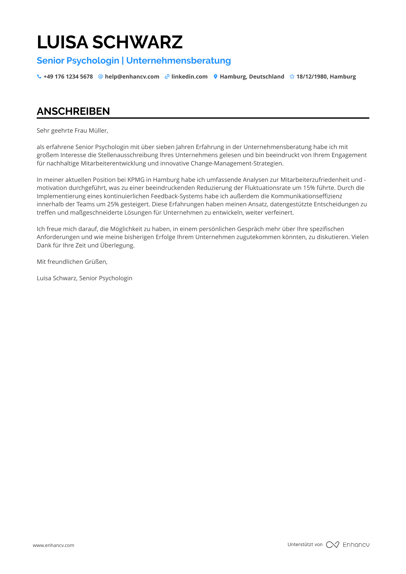 - Soft Skills and Leadership - Das Anschreiben hebt die Bedeutung von zwischenmenschlichen Fähigkeiten und Führungsqualitäten hervor. Durch spezifische Beispiele wird deutlich, wie die Bewerberin erfolgreich Teams geleitet und Motivation in herausfordernden Projekten bewahrt hat, was zu messbaren Erfolgen geführt hat.
