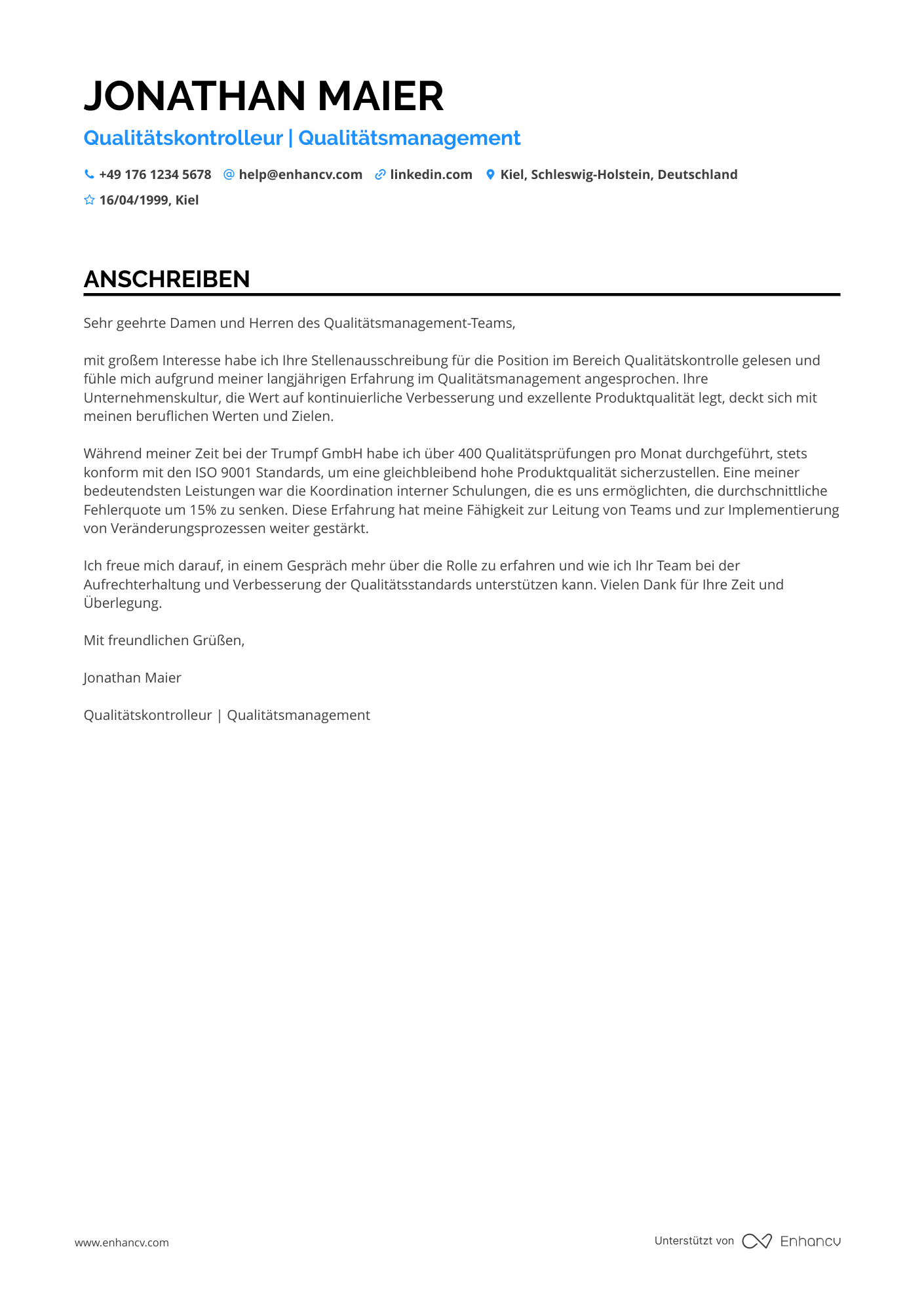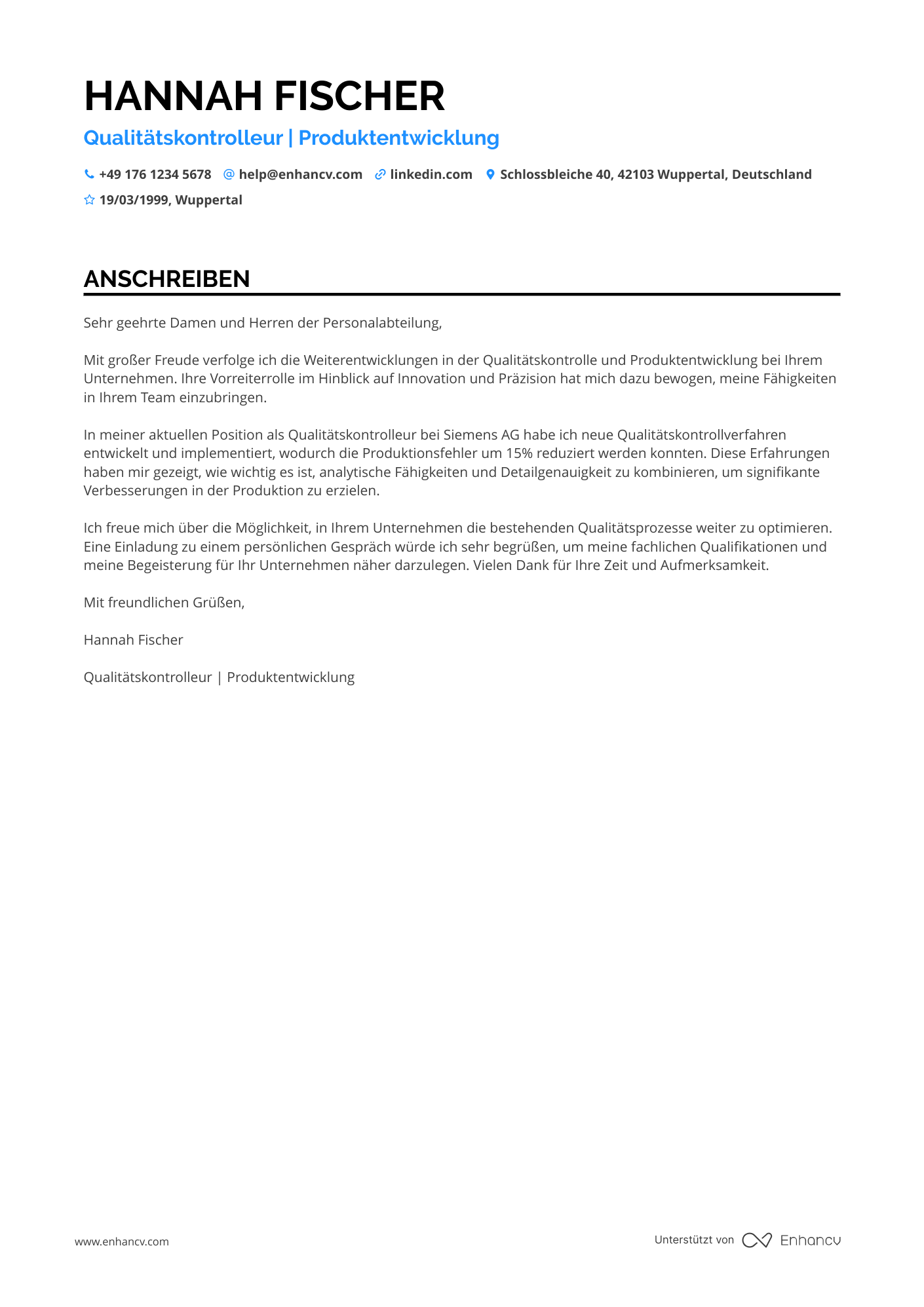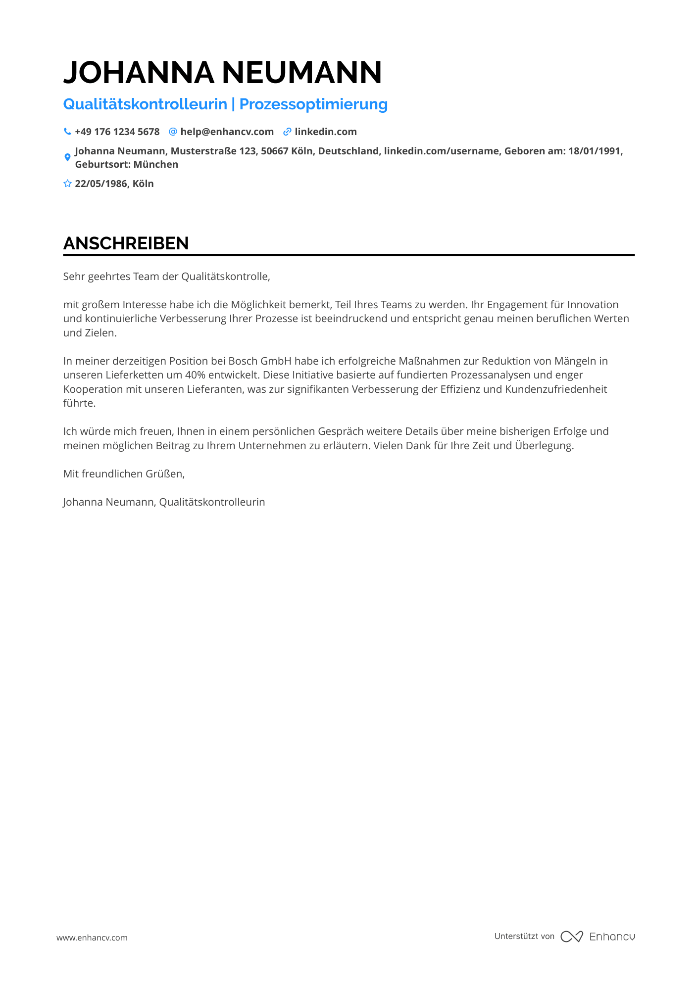 Eine häufige Herausforderung im Anschreiben für Qualitätskontrolleure ist, die technischen Fähigkeiten und die Liebe zum Detail überzeugend darzustellen. Unsere Anschreibebeispiele helfen Ihnen dabei, diese Qualifikationen klar und prägnant zu formulieren und sich so von anderen Bewerbern abzuheben. Schauen Sie sich die folgenden Beispiele an, um Inspiration zu finden und Ihr perfektes Anschreiben zu erstellen.