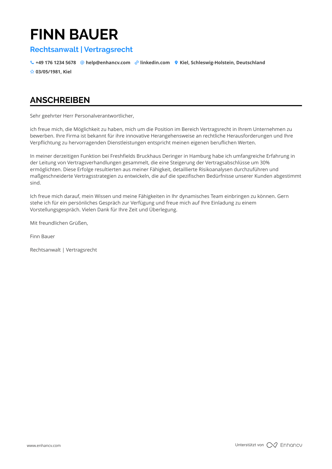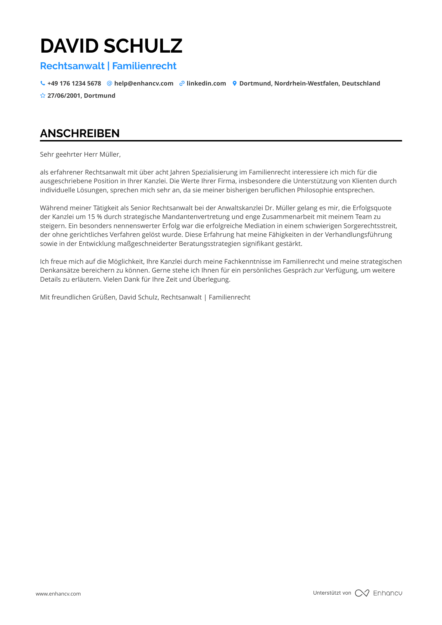Eine häufige Herausforderung für einen Rechtsanwalt ist das präzise Darstellen komplexer juristischer Fähigkeiten in einem Anschreiben. Unsere Anschreiben-Beispiele bieten dir klare Formulierungen und Strukturen, die dir helfen, deine Fachkompetenz überzeugend darzustellen. Schau dir die folgenden Beispiele an, um dein eigenes Anschreiben zu optimieren.
