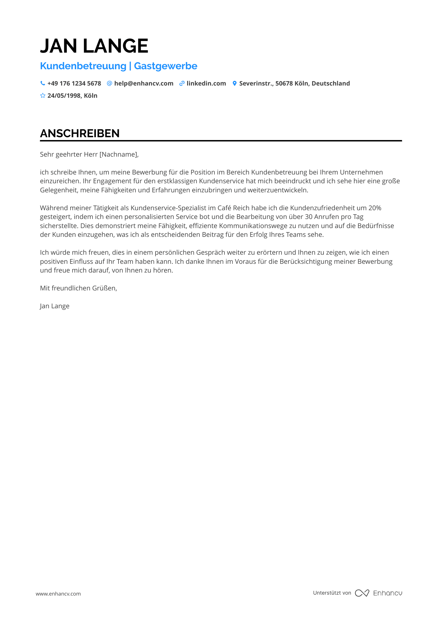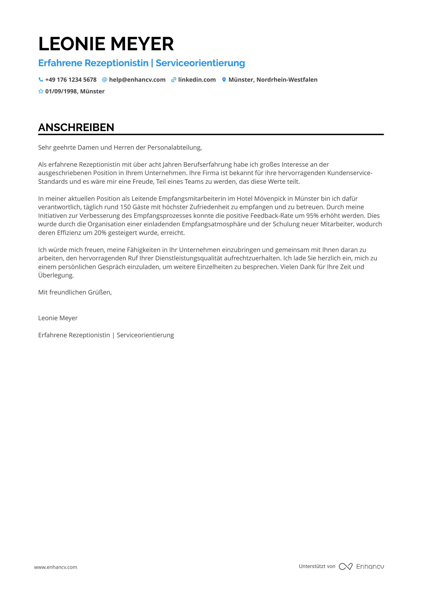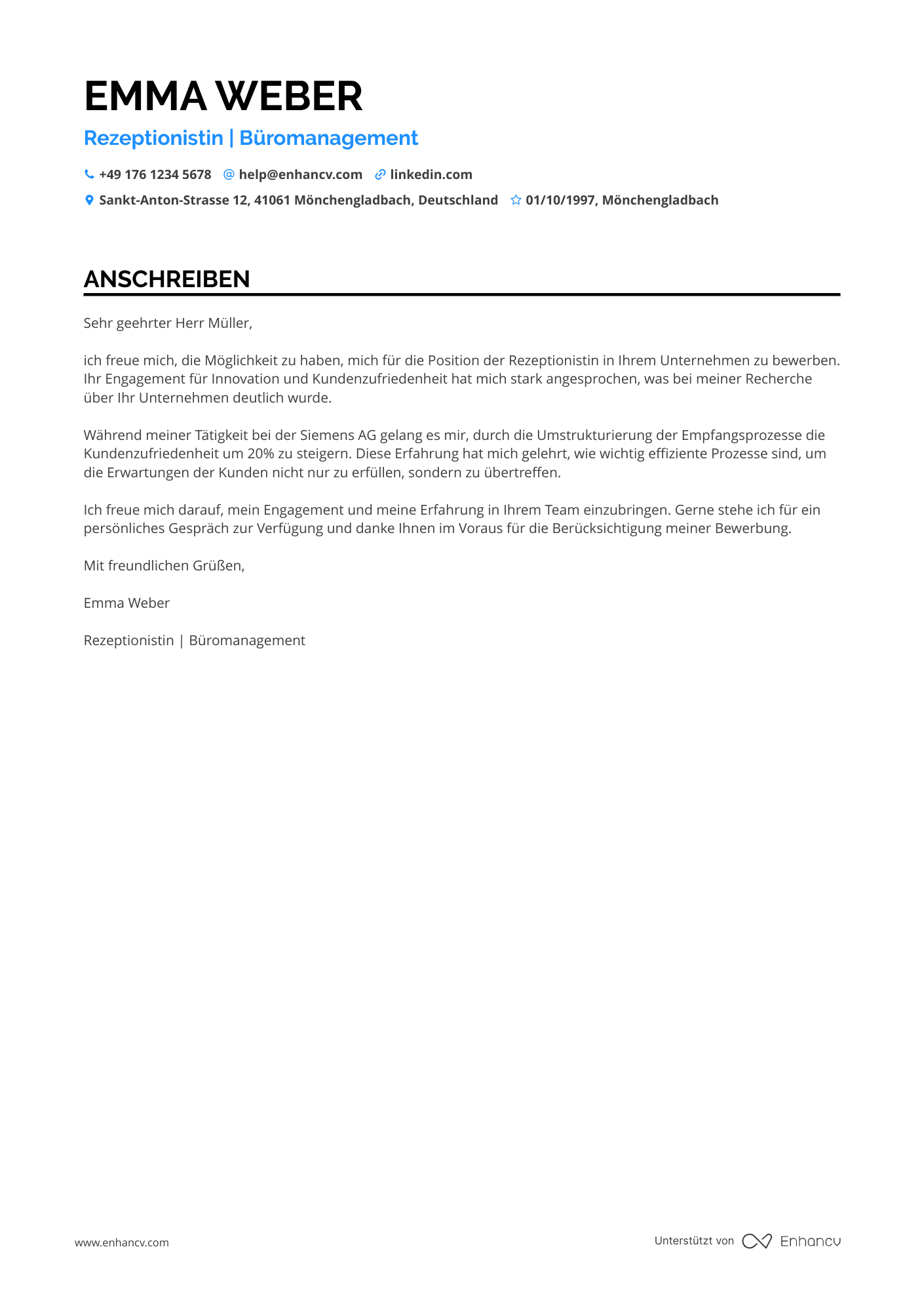 Eine häufige Herausforderung bei der Erstellung eines Bewerbungsschreibens für eine Rezeptionistin ist die Betonung der Kundenservice-Fähigkeiten. Unsere Bewerbungsschreiben-Beispiele zeigen dir, wie du diese Fähigkeiten überzeugend darstellen kannst, um potenzielle Arbeitgeber zu beeindrucken. Sieh dir die folgenden Beispiele an, um Inspiration für dein eigenes Bewerbungsschreiben zu erhalten.