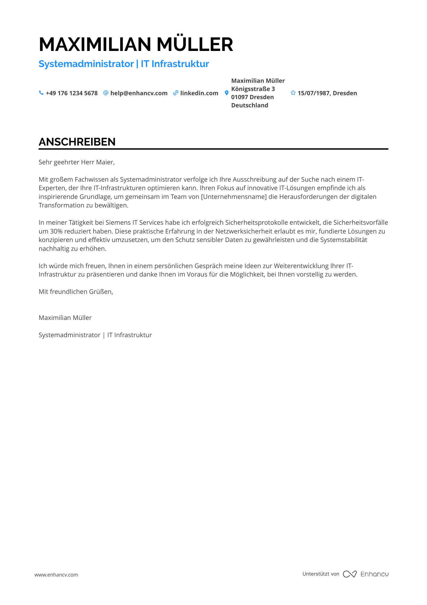 Ein häufiges Problem für Systemadministratoren in Bewerbungsschreiben ist die effektive Darstellung ihrer technischen Expertise. Unsere Anschreiben-Beispiele bieten dir klare Formulierungen und Strukturen, um diese Herausforderung zu meistern. Entdecke unten unsere speziell entworfenen Beispiele.