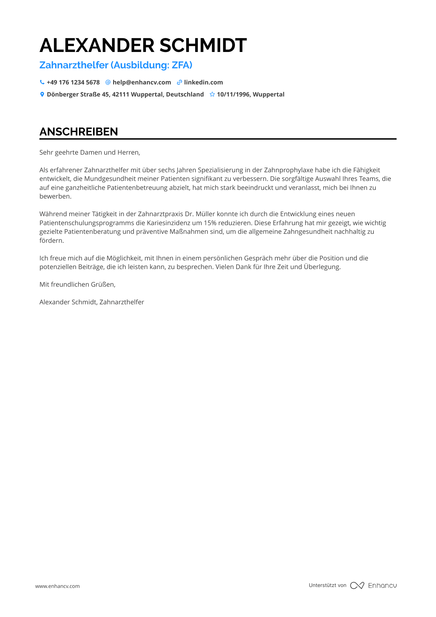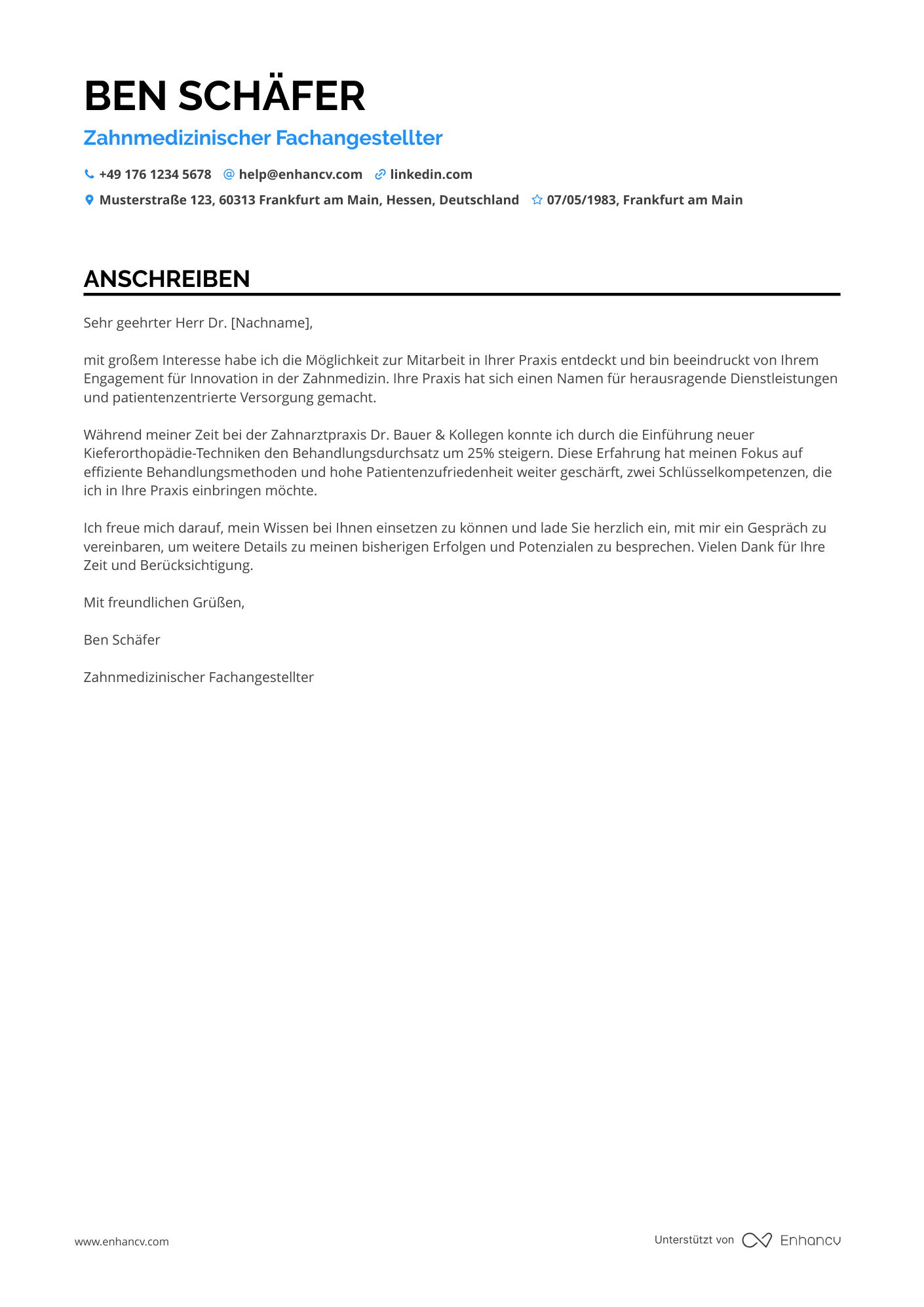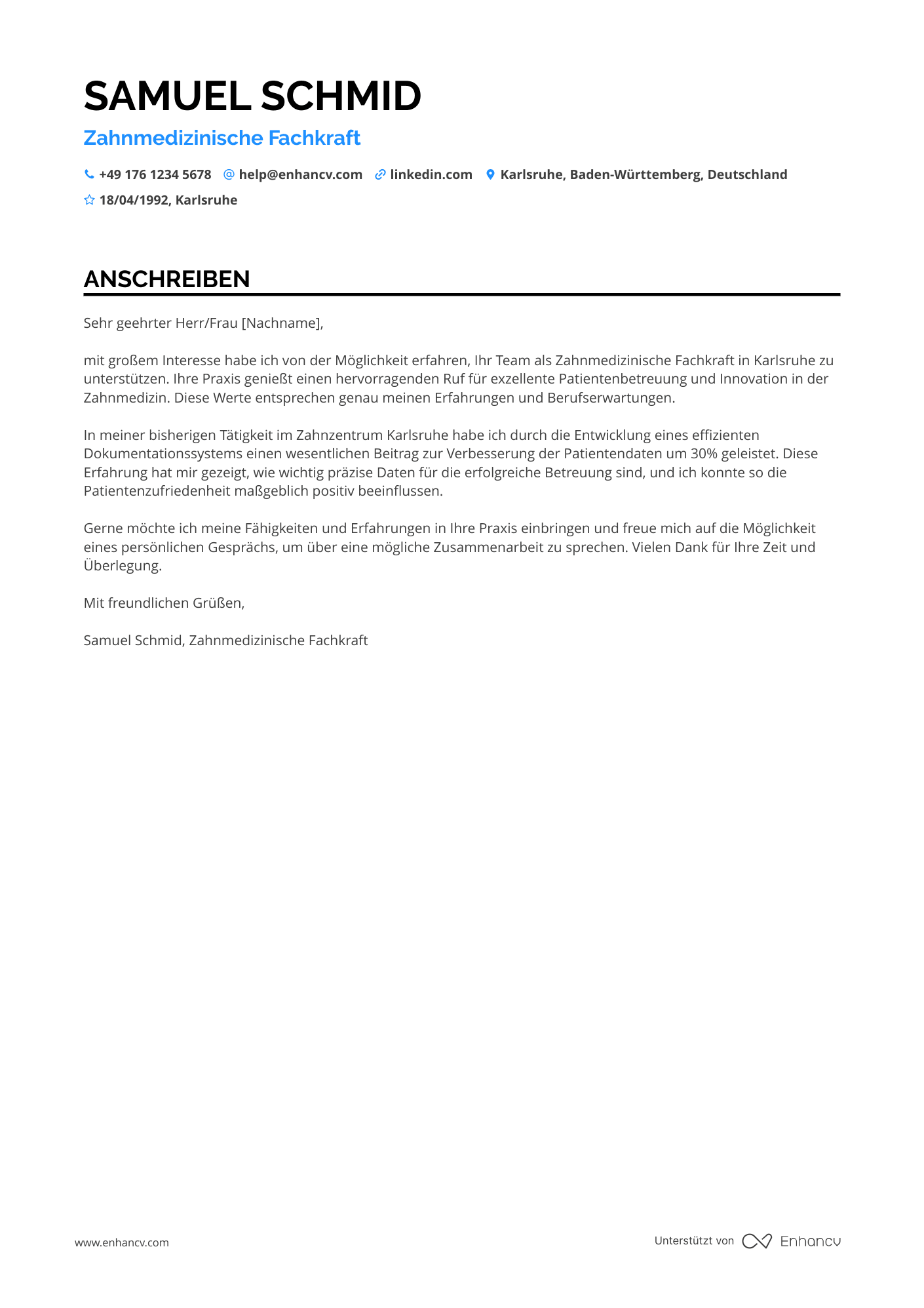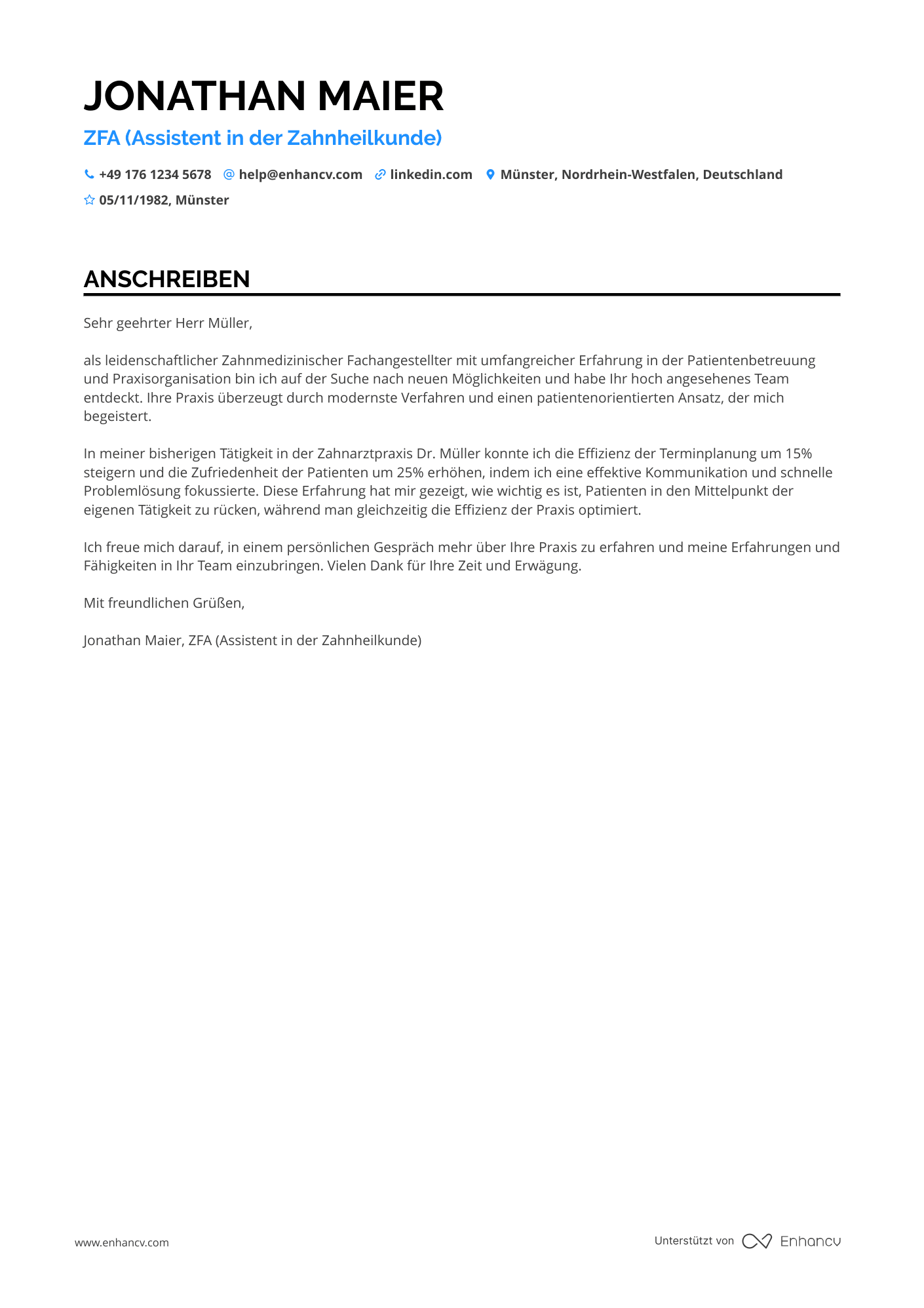 Eine häufige Herausforderung beim Anschreiben für Zahnarzthelferinnen besteht darin, ihre vielfältigen Aufgaben und Fähigkeiten überzeugend darzustellen. Unsere Anschreiben-Beispiele helfen Ihnen, diese Herausforderung zu meistern, indem sie klare Formulierungen und strukturierte Inhalte bieten. Entdecken Sie die Beispiele unten, um den perfekten Einstieg zu finden.
