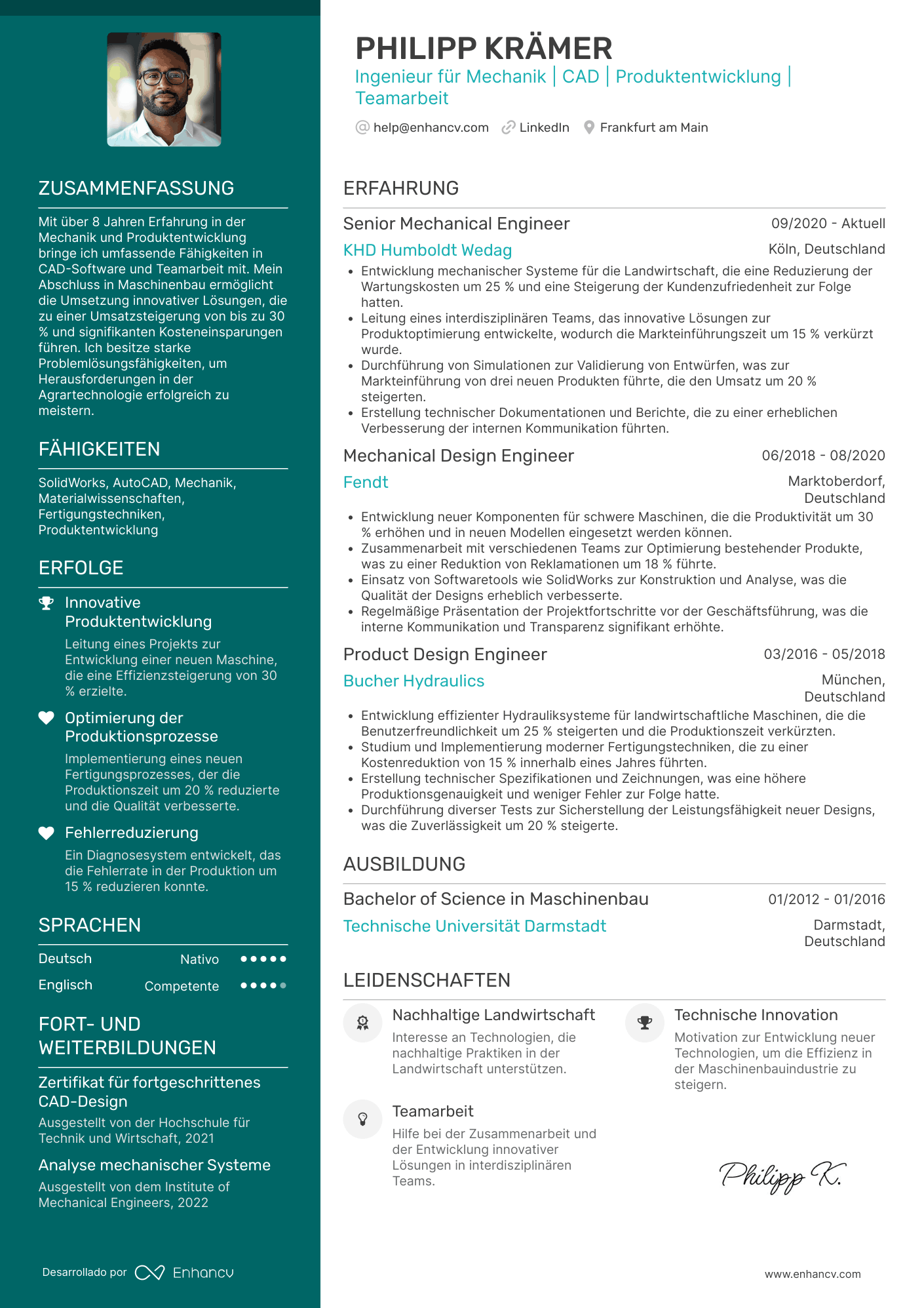 - du Tools wie den Enhancv-Lebenslauf-Editor nutzt, der digitale Signaturen automatisch integriert und Lebenslauf-Muster anbietet