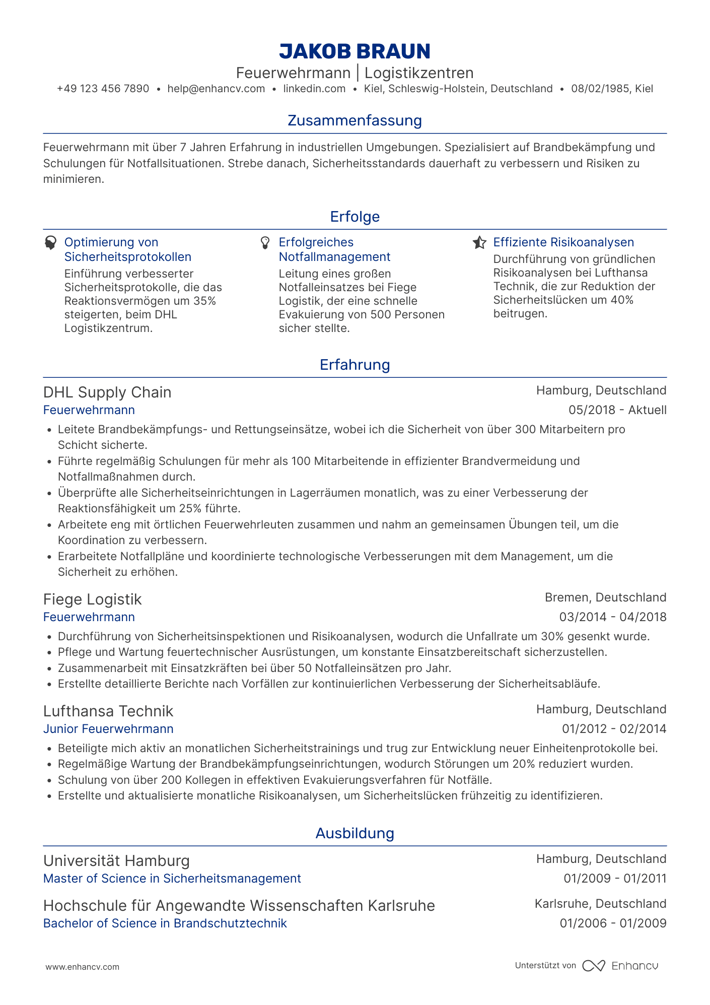 Lebenslauf in Feuerwehrmann für Logistikzentren