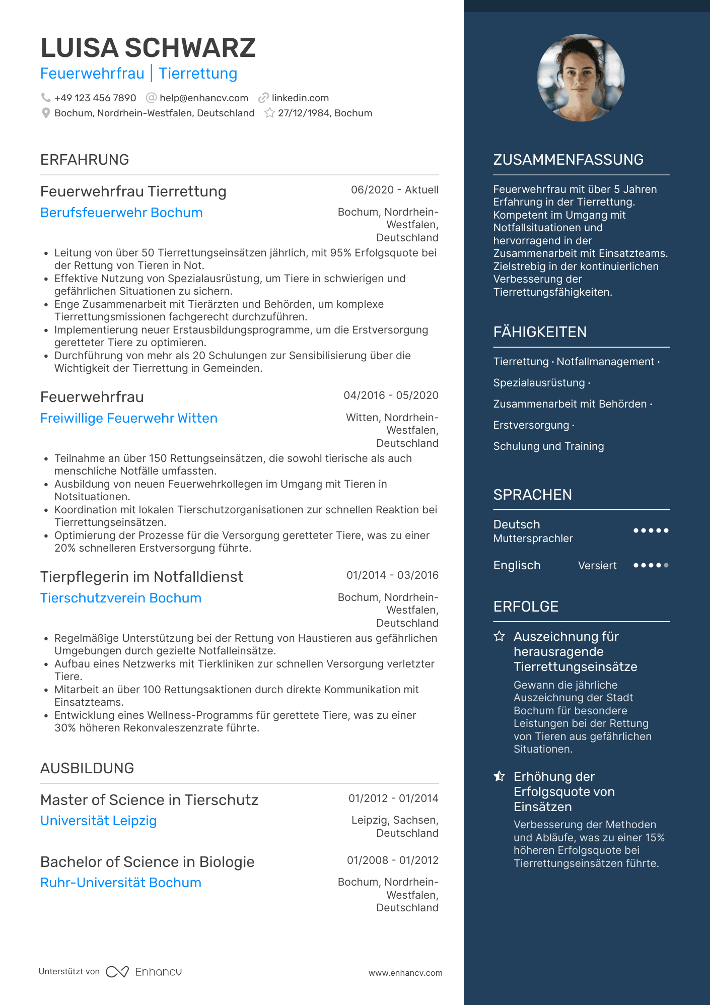 Lebenslauf als Feuerwehrmann für Tierrettung