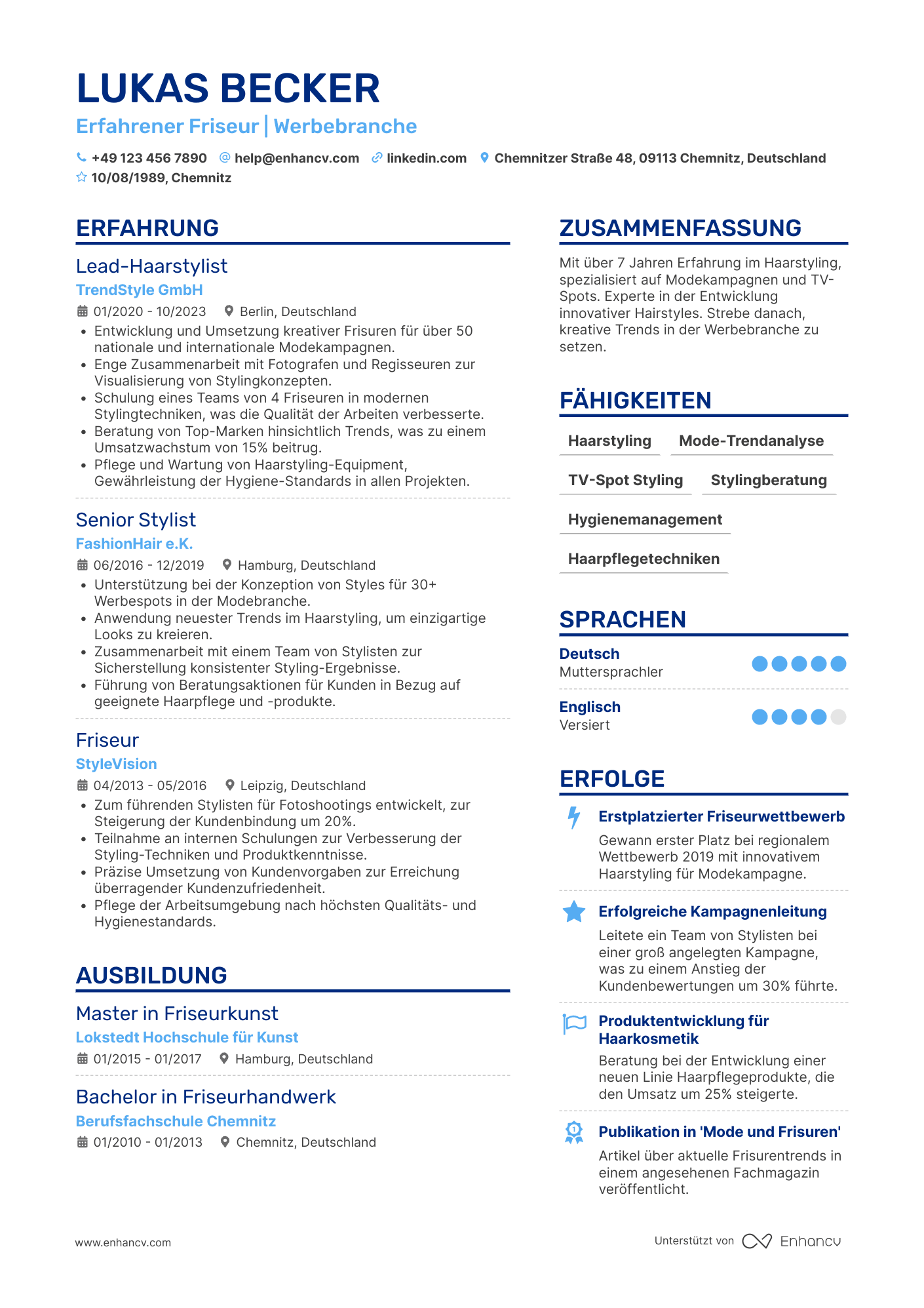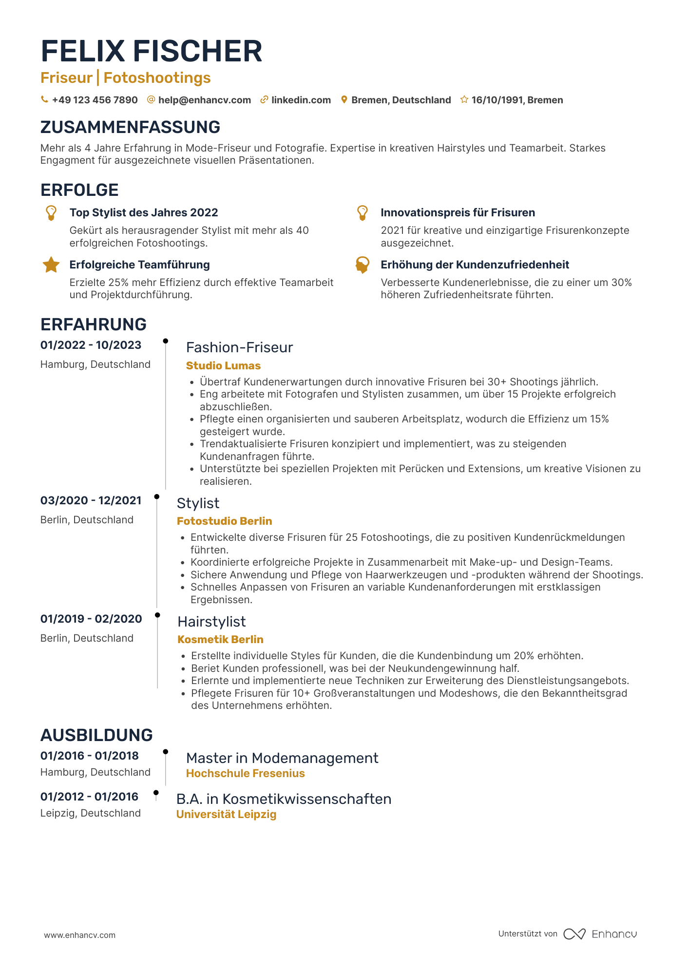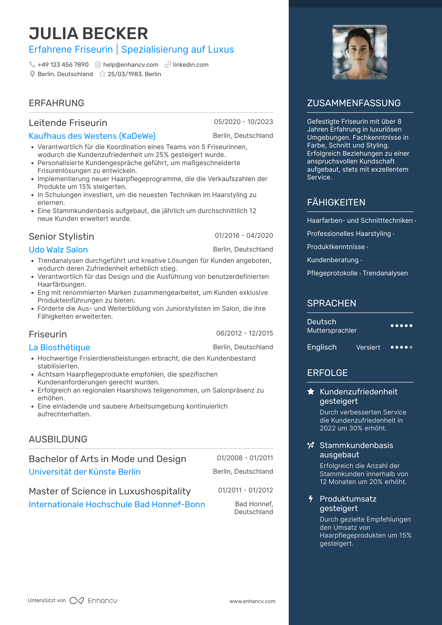 - Storytelling, das die Leidenschaft für Farbkunst weckt – Ein herausragender Lebenslauf fesselt die Lesenden, indem er über technische Aufzählungen hinausgeht und kurze, lebendige Einblicke in transformative Farbprojekte oder Kundenumstylings gibt. Indem Momente eingewoben werden, die sowohl kreative Erfüllung als auch die Freude der Kundschaft zeigen, entsteht eine emotionale Verbindung, die die Bewerberin nicht nur als talentierte Friseurin, sondern als jemanden im Gedächtnis behält, der echte Freude daran hat, Farbvisionen Wirklichkeit werden zu lassen.