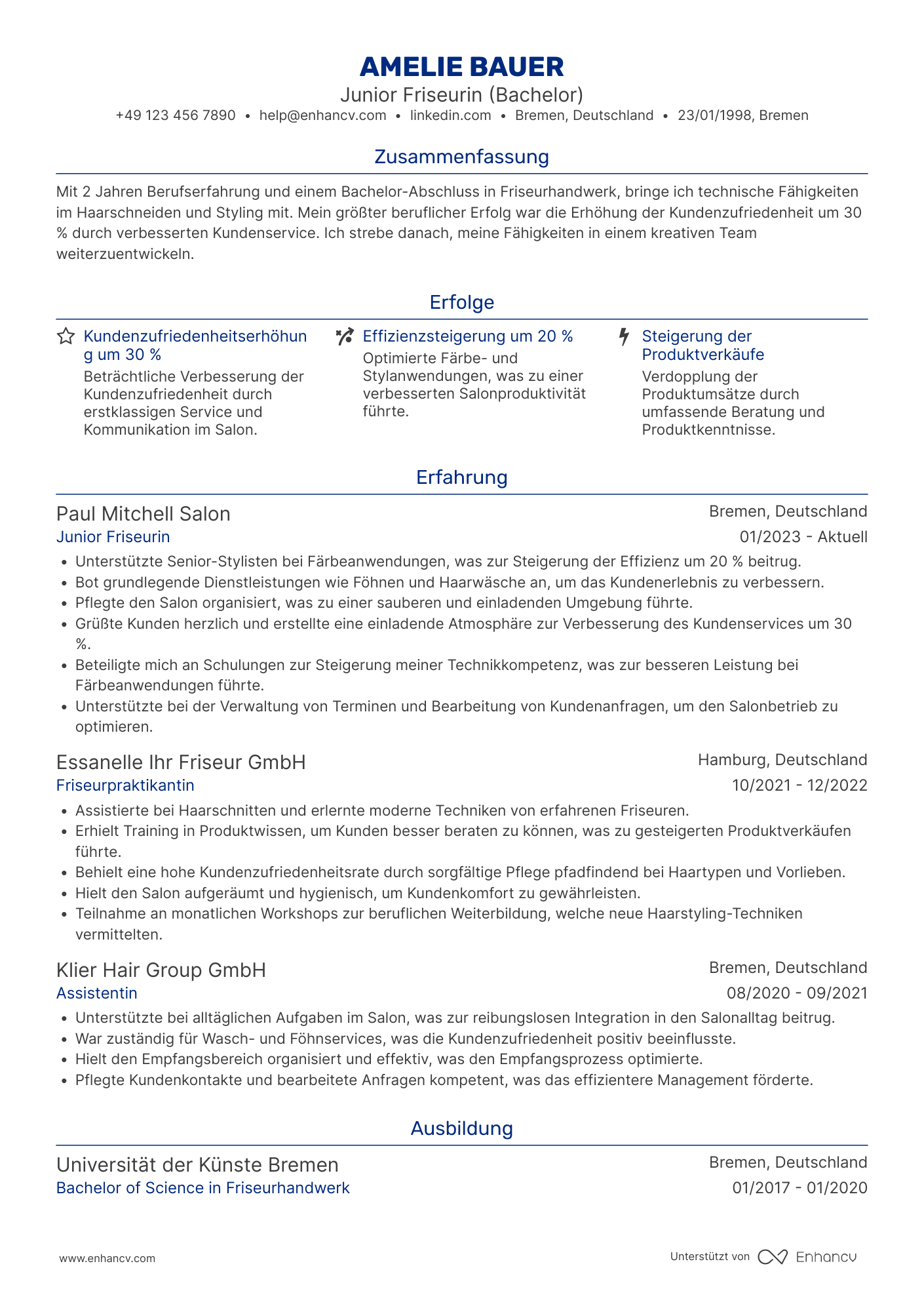 - Ein einheitliches professionelles Auftreten präsentieren – Ein herausragender Lebenslauf als Junior Friseurin stimmt nahtlos mit dem Lebenslauf und dem LinkedIn-Profil der Kandidatin überein, indem er denselben Ton in der persönlichen Stellungnahme, den gleichen visuellen Stil und die hervorgehobenen Fähigkeiten verwendet, um eine kohärente und professionelle Identität auf allen Plattformen zu schaffen. Arbeitgeber erhalten ein klares, konsistentes Bild der individuellen Marke, sodass kein Zweifel an ihrem Engagement für die Branche und die angestrebten Positionen besteht.