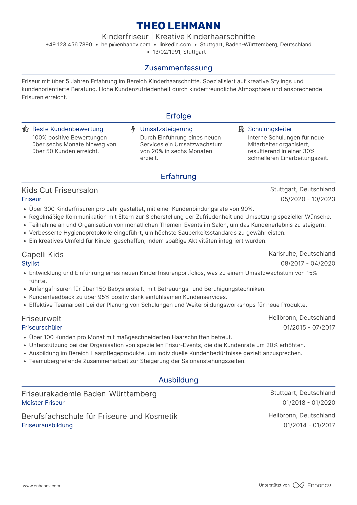 - Betonung messbarer Erfolge mit jungen Kunden – Die Hervorhebung konkreter Leistungen, wie zum Beispiel eine nachweisliche Anzahl positiver Rückmeldungen von Eltern oder ein deutlicher Anstieg von wiederkehrenden Terminen für Kinderhaarschnitte, weist gezielt auf eine bewährte Fähigkeit hin, sich speziell bei der Zielklientel hervorzuheben, und stellt sicher, dass der Lebenslauf auf die besonderen Anforderungen der Position eingeht.