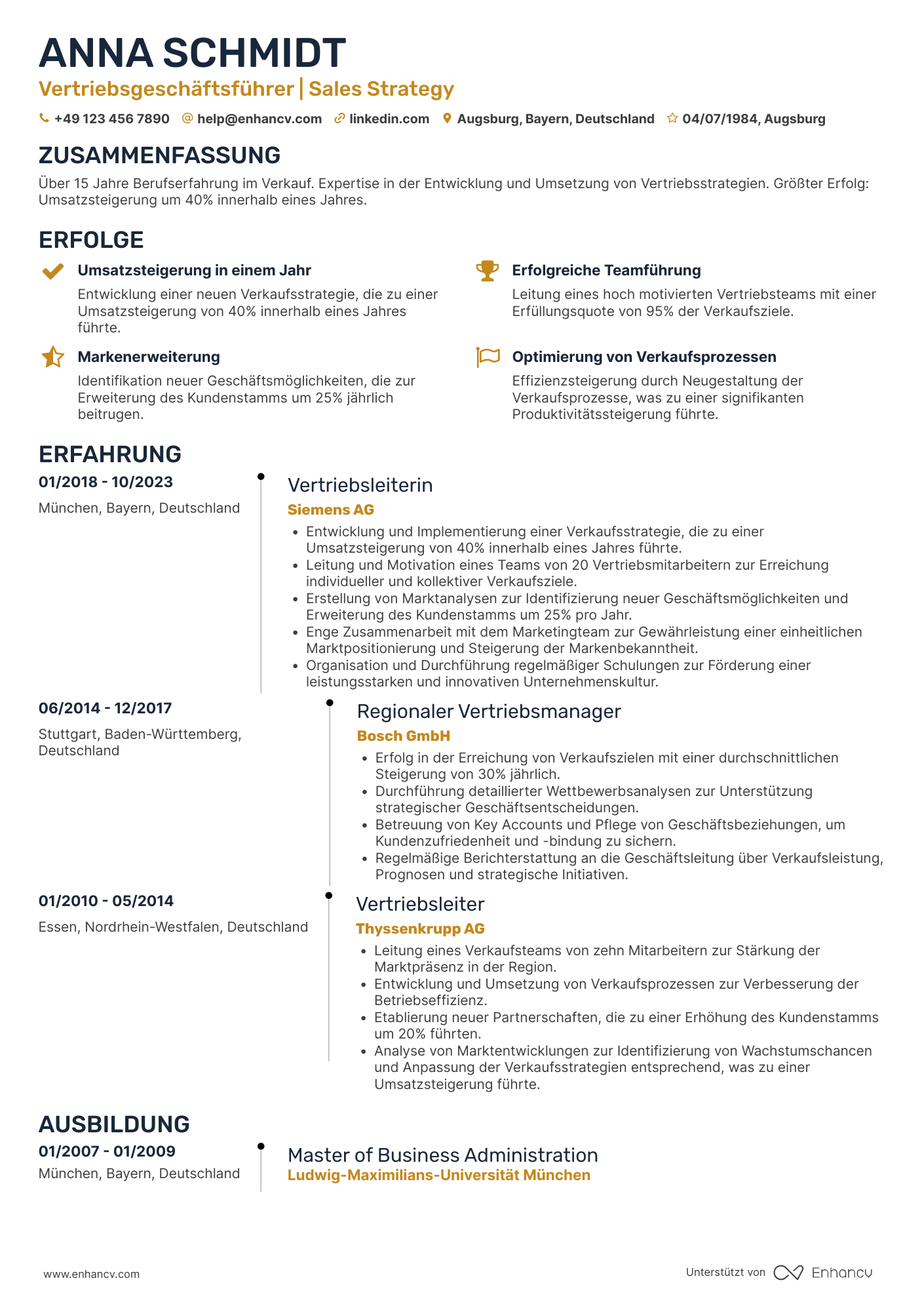 - Hervorhebung eines unverwechselbaren Führungsprofils – Was eine außergewöhnliche Bewerbung auszeichnet, ist die Präsentation einzigartiger strategischer Beiträge – etwa die Vorreiterrolle bei einer digitalen Vertriebstransformation, das konsequente Übertreffen von Umsatzzielen in volatilen Märkten oder das Führen bereichsübergreifender Teams zur internationalen Expansion. Diese Schwerpunkte liefern eine überzeugende Erzählung darüber, dass der Kandidat in der Lage ist, Komplexität zu meistern und nachhaltige wirtschaftliche Wirkung über die üblichen Erwartungen hinaus zu erzielen.
