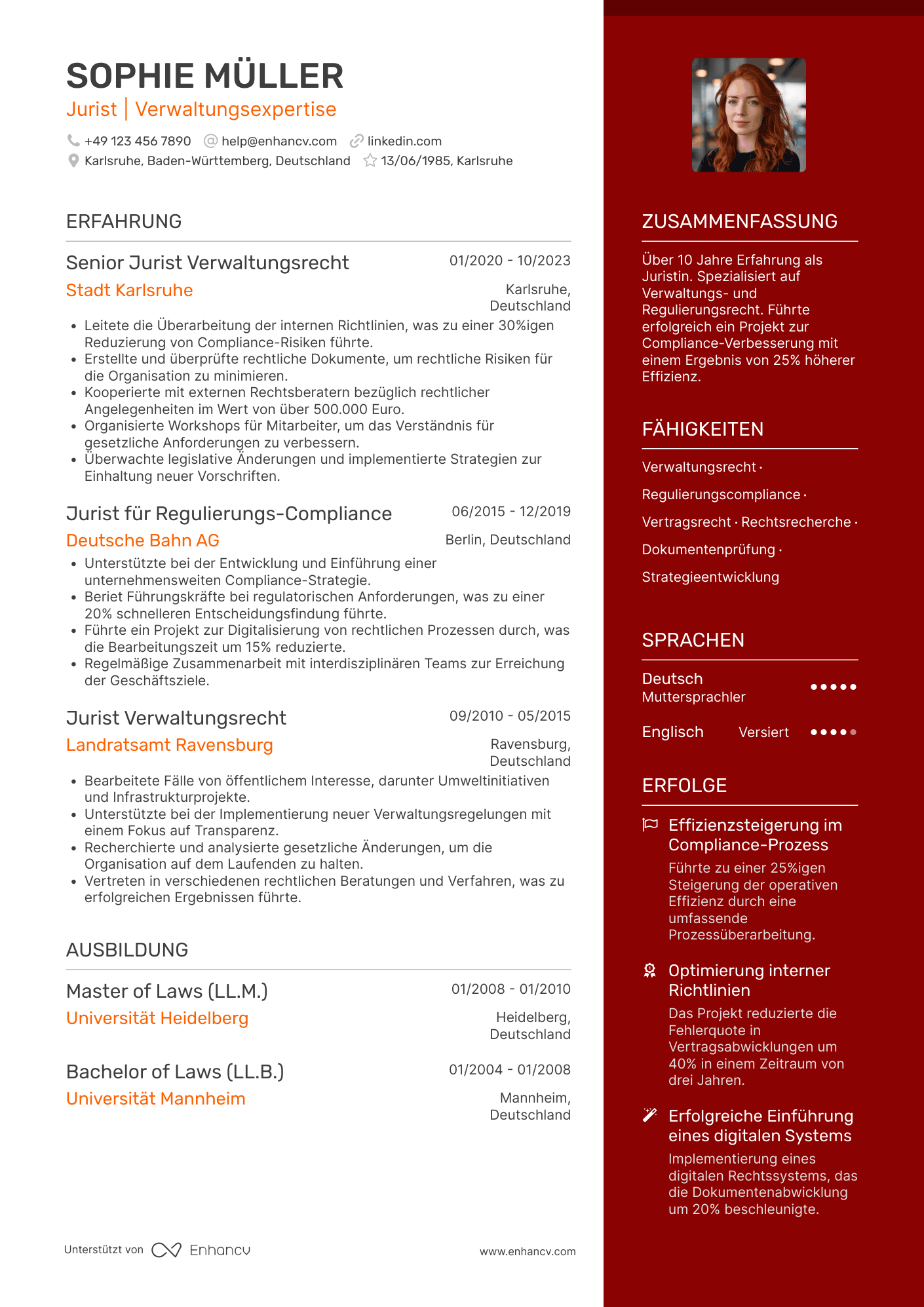 - Eine persönliche Verbindung durch Erzählung schaffen – Ein Lebenslauf für einen Fachjuristen, der sofort Authentizität und Individualität vermittelt, fesselt den Recruiter von Anfang an. Wenn Beweggründe, zentrale Erfolge und wichtige Karriereschritte kunstvoll in eine überzeugende berufliche Geschichte eingebettet werden, hinterlässt dies einen bleibenden Eindruck, der den Kandidaten von generischeren Bewerbungen abhebt.