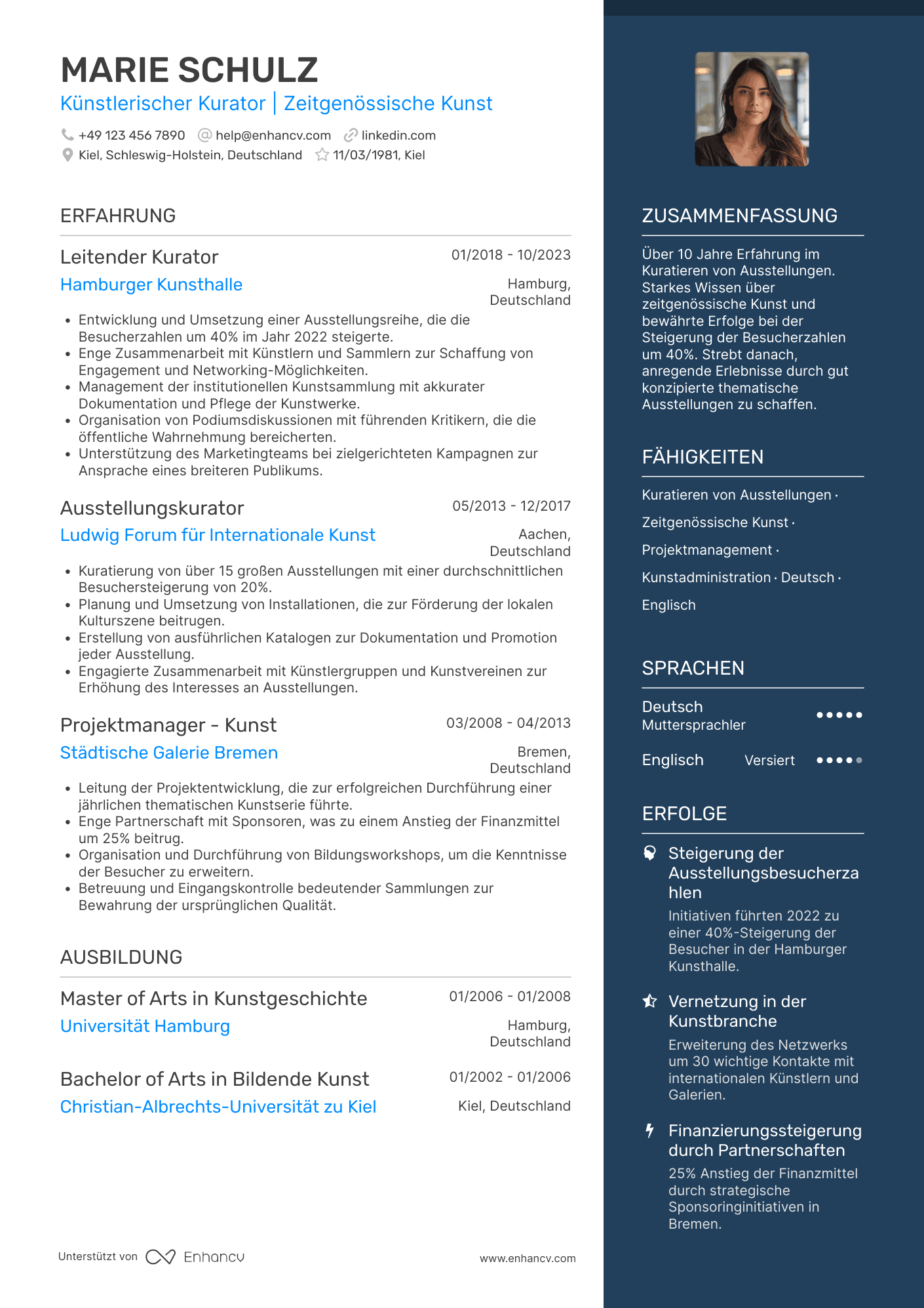 - Vermittelt eine begeisternde und inspirierende Leidenschaft – Die einprägsamsten kuratorischen Lebensläufe strahlen Begeisterung für den kulturellen Auftrag und ein echtes Engagement für den künstlerischen Dialog aus. Sorgfältig ausgewählte Projektbeschreibungen und bedeutende Resultate – etwa das Zusammenbringen von Communities oder das Verstärken aufstrebender Stimmen – machen den Lebenslauf nicht nur zu einem Nachweis bisheriger Anstellungen, sondern zu einer fesselnden Wirkungsgeschichte, die emotional beim Lesenden nachhallt.
