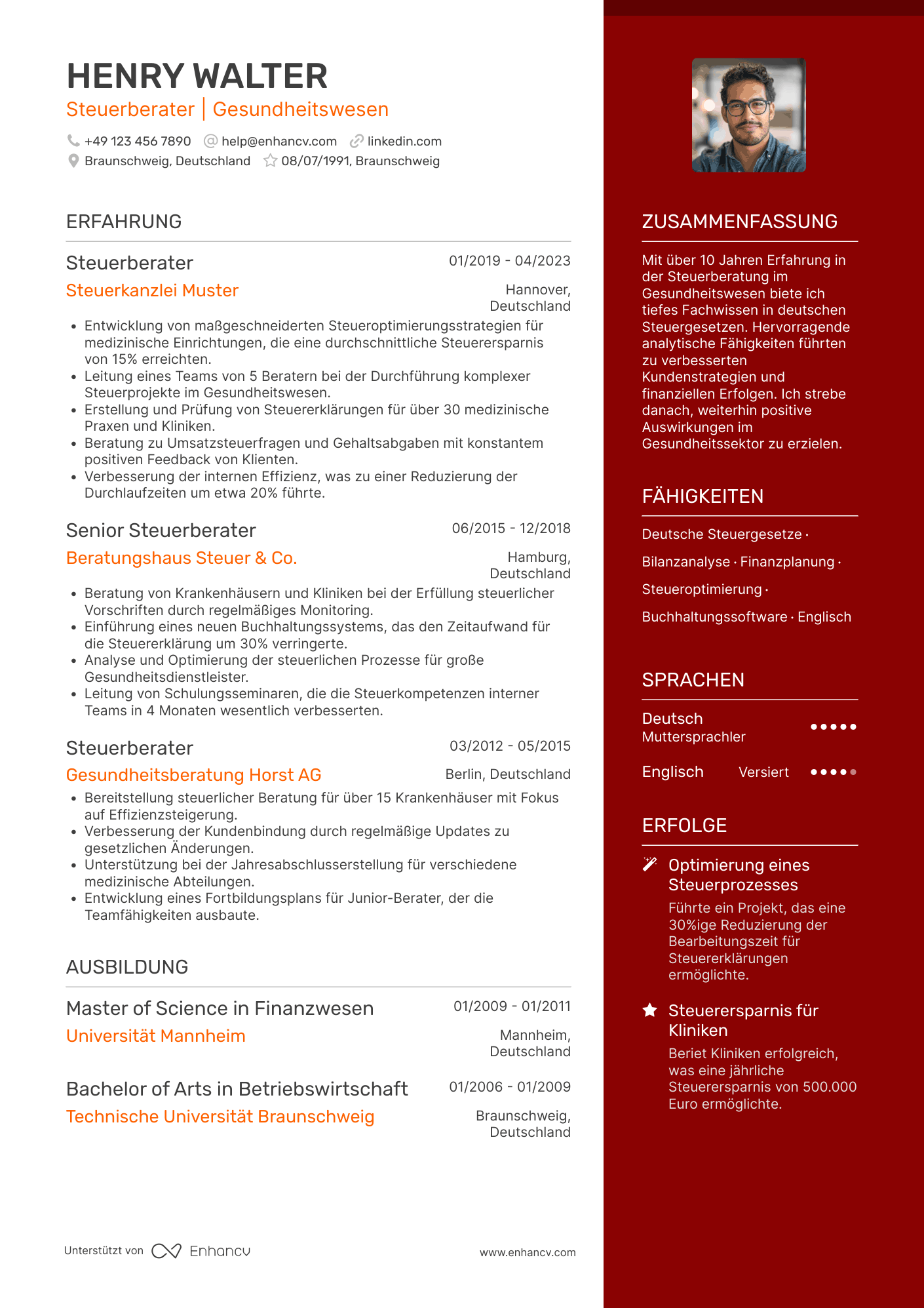 Lebenslauf in Steuerberater im Gesundheitswesen