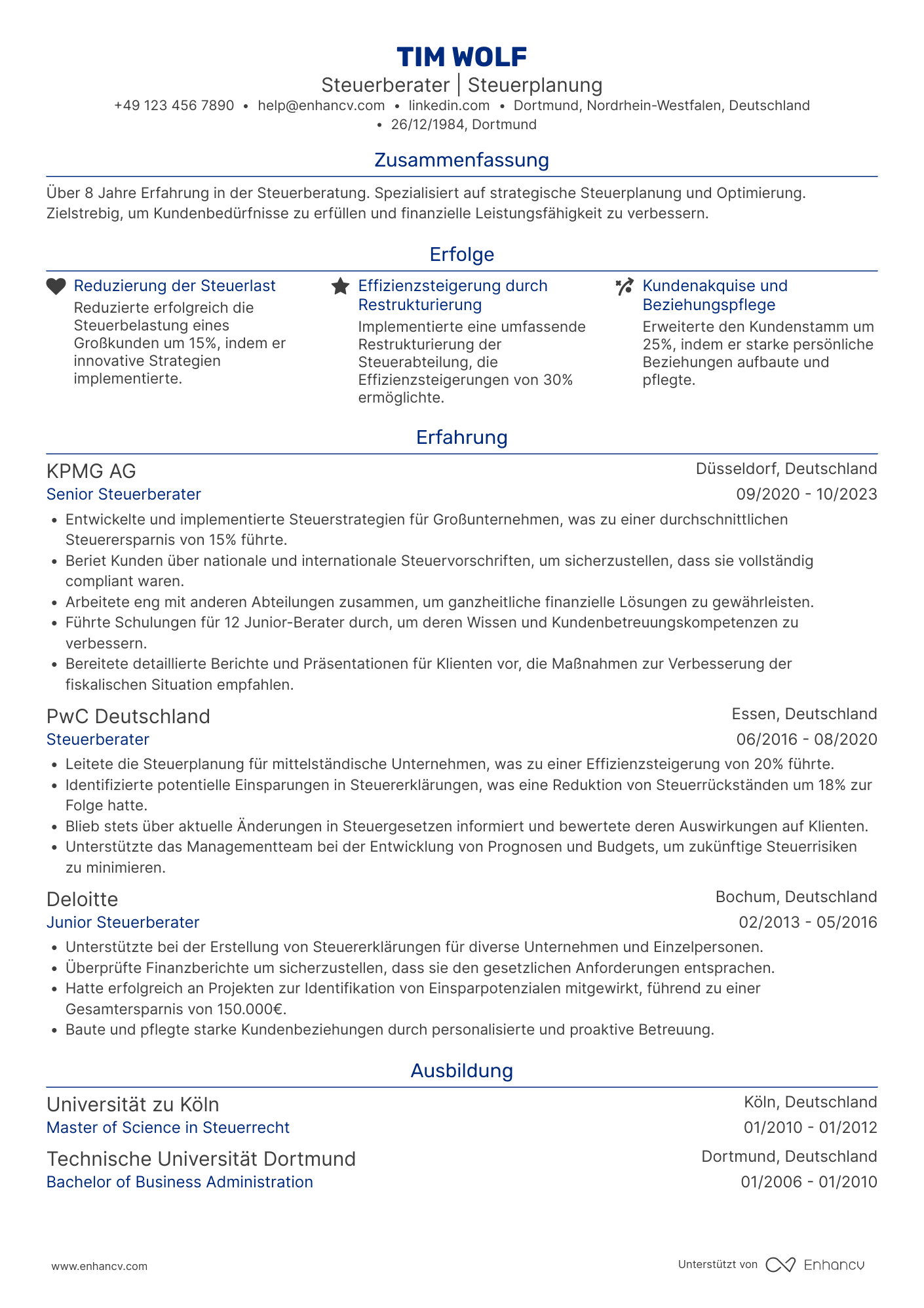 - Messbare Erfolge und erfolgreiche Strategien – Erreichte Leistungen werden durch klare, quantifizierbare Ergebnisse betont, wie etwa das Erzielen erheblicher Steuerersparnisse durch innovative Umstrukturierungen oder die Optimierung von Compliance-Prozessen, die Prüfungsfeststellungen um einen bestimmten Prozentsatz reduzierten. Diese konkreten Resultate verdeutlichen den direkten Einfluss des Kandidaten und belegen seine Fähigkeit, im Bereich der Steuerplanung messbaren Mehrwert zu liefern.