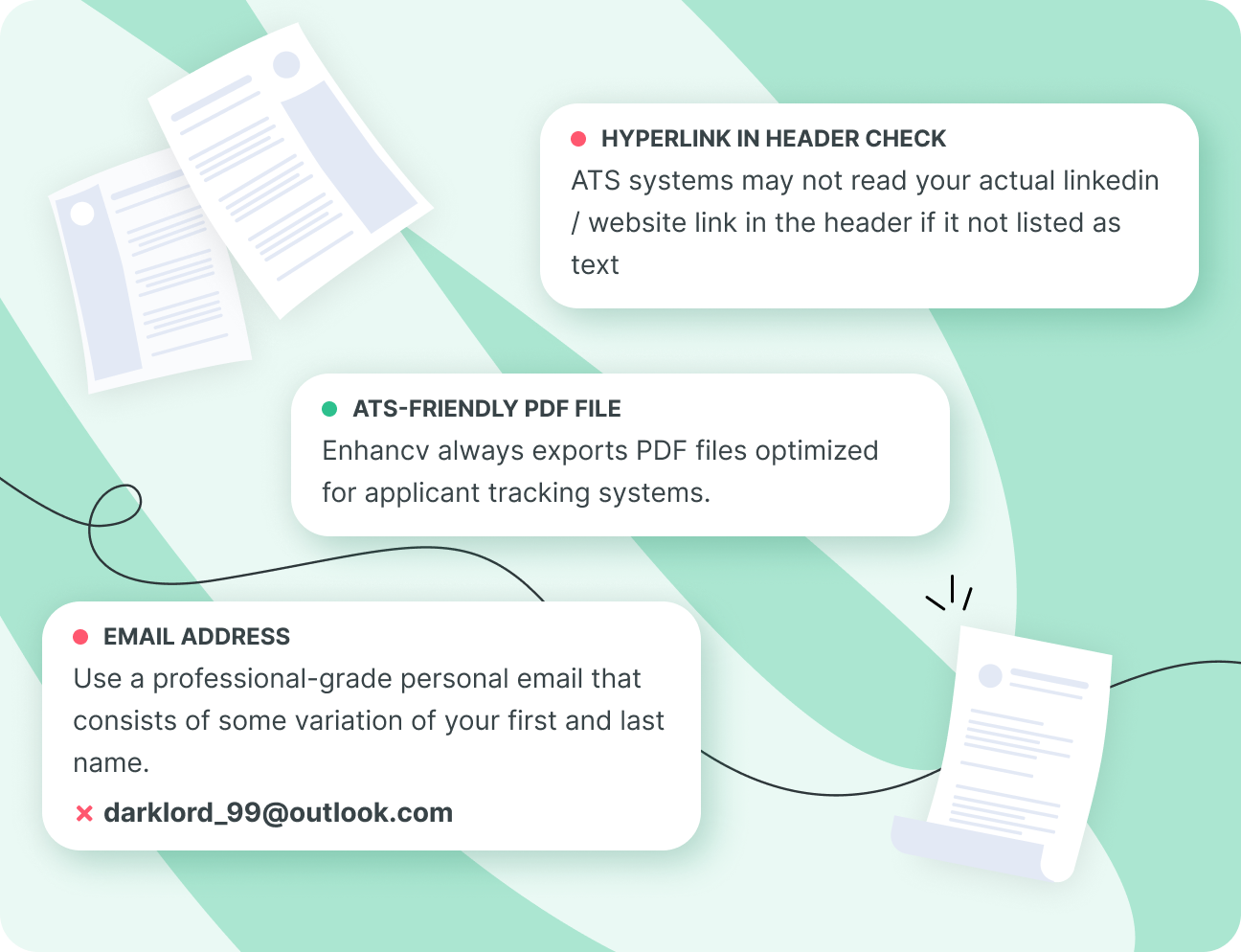 Stay polished and optimized for applicant tracking systems. Enhancv monitors 19 crucial ATS criteria, providing evaluation and guidance in real time so you can write confidently without risking critical ATS errors. Export your resume as a PDF to guarantee proper parsing and apply with confidence.