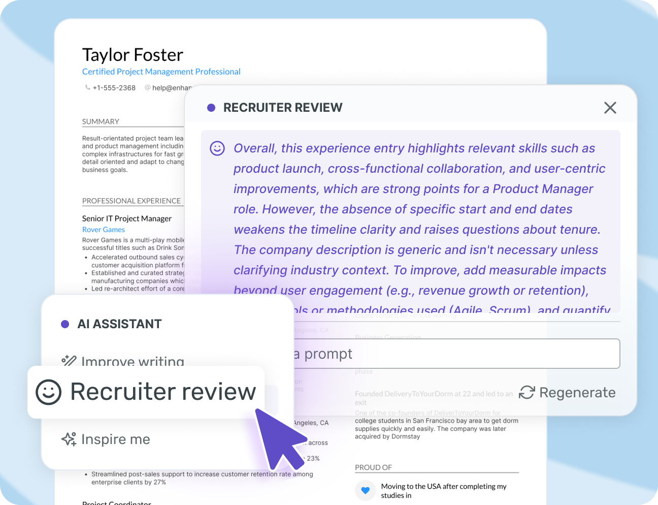 Get smart recommendations to make your text authentic and recruiter-ready. Write confidently in your own words with real-time resume writing advice. Enhancv keeps track of style and grammar while helping you turn generic responsibilities into quantifiable achievements.