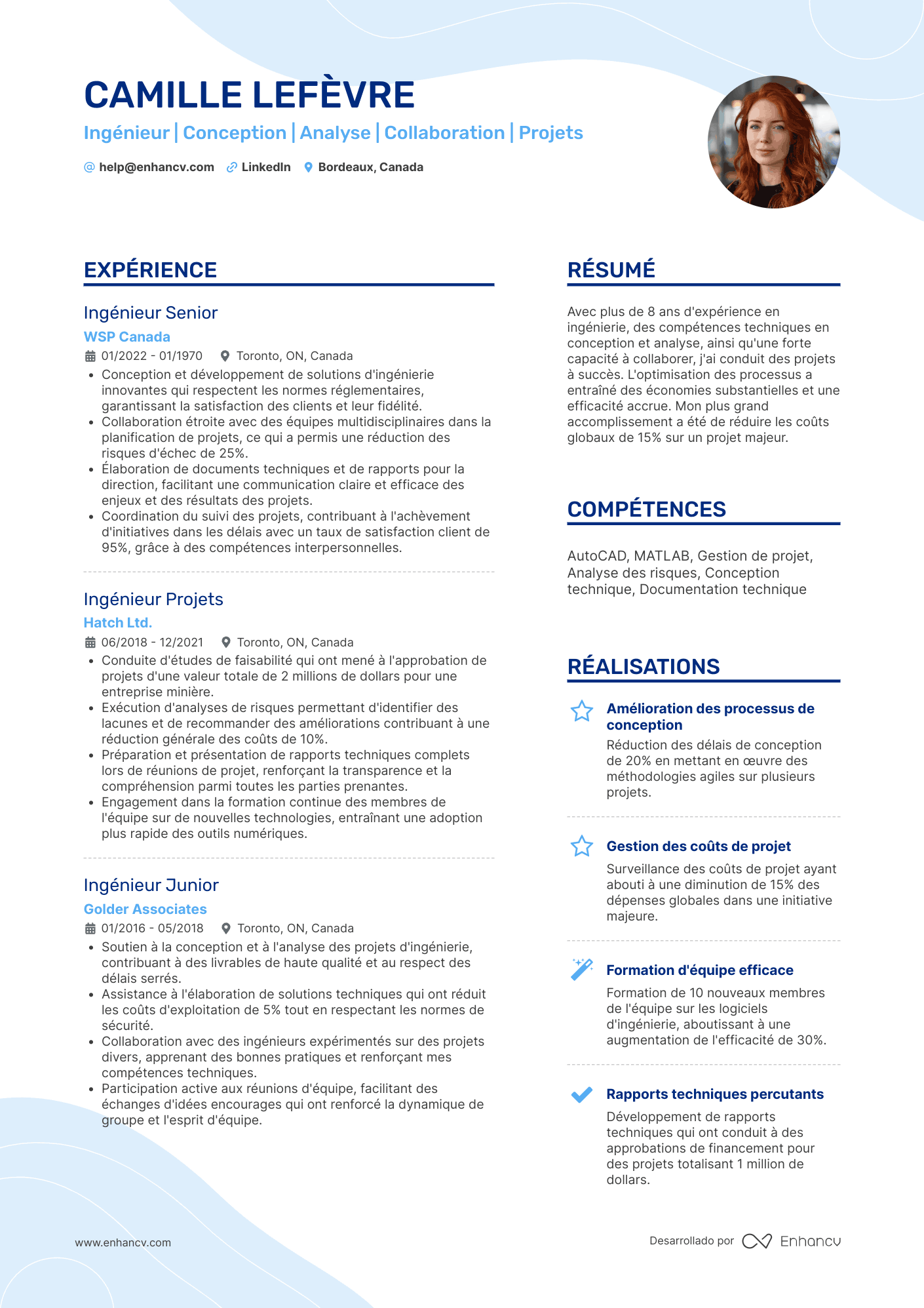 LeCV d'Ingénieur met l'accent sur les compétences techniques, les projets de conception et d'ingénierie réussis et les certifications obtenues (pourvu qu’elles soient pertinentes).