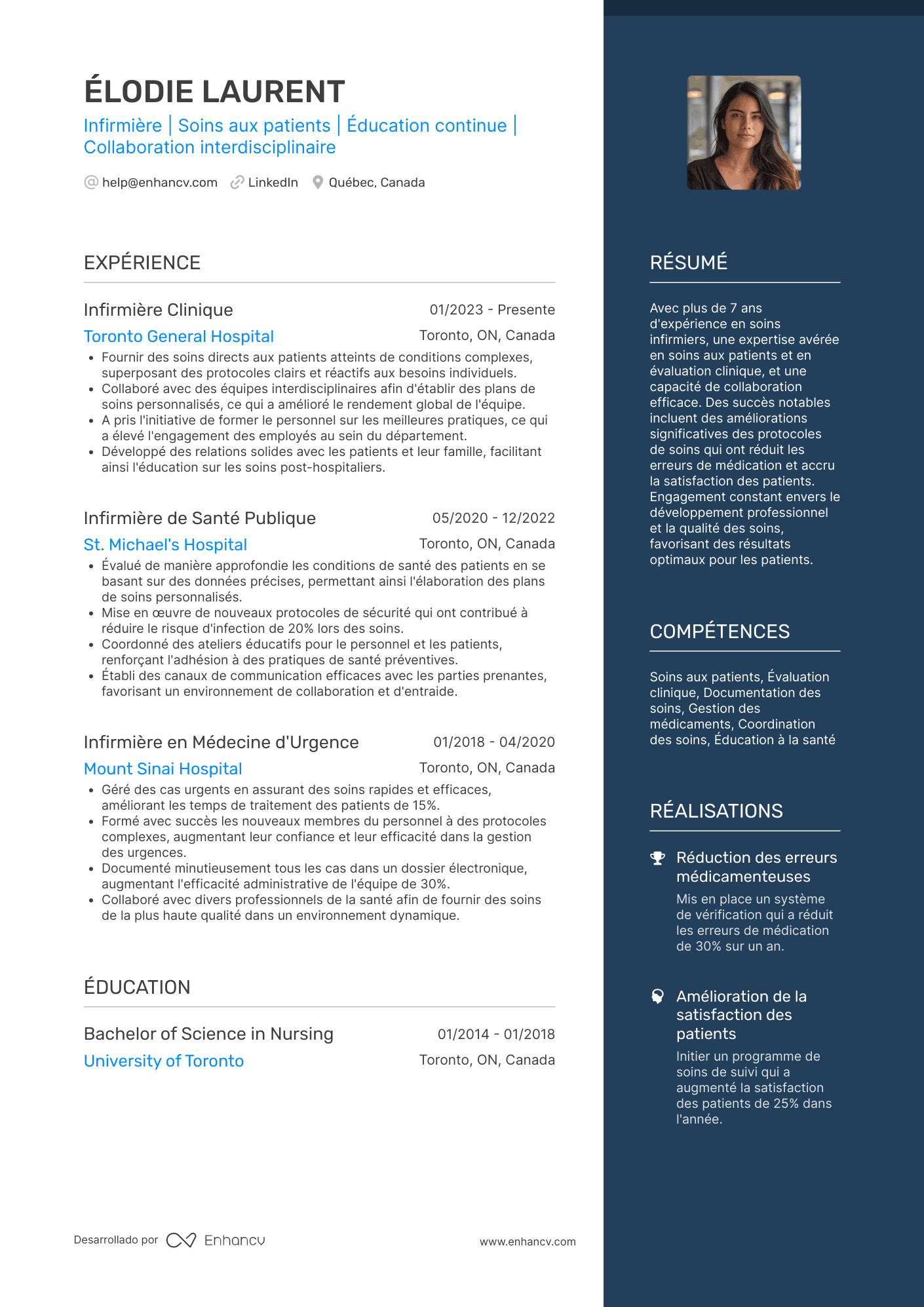 Soulignez votre statut auprès de l’ordre des infirmières (par exemple l’OIIQ (Ordre des infirmières et infirmiers du Québec) au Québec ou le CNO (College of Nurses of Ontario) en Ontario). Indiquez clairement votre capacité à travailler dans un environnement bilingue si c’est le cas, car la communication patient-professionnel est centrale.