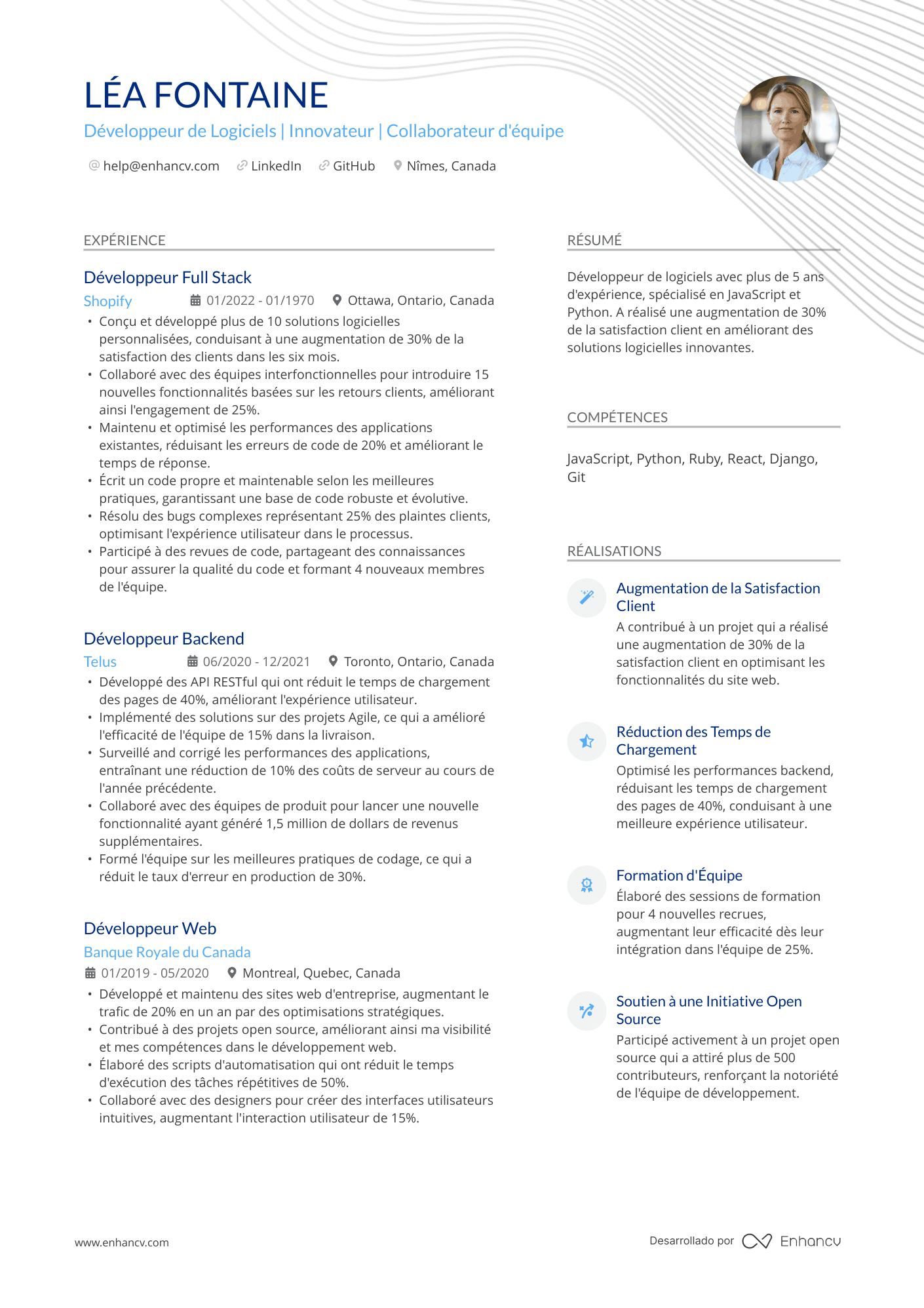 Illustrez vos expériences par des projets concrets et mesurables (exemples : contributions GitHub, améliorations des performances d’un site e-commerce, etc.). Au Canada, les recruteurs valorisent la preuve tangible des compétences plus que les longues descriptions techniques.
