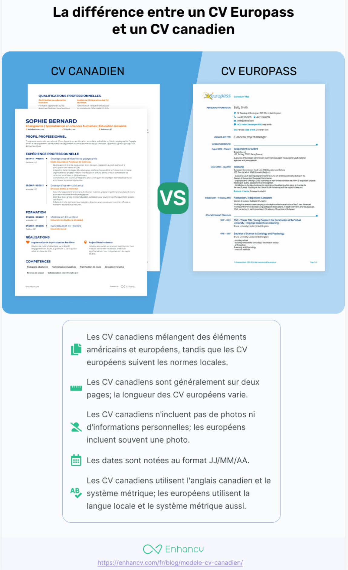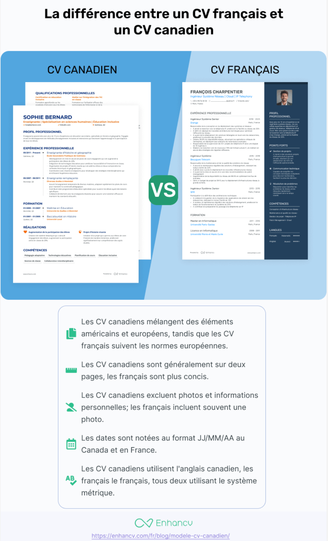 Les CV français suivent les normes européennes et sont généralement concis. Contrairement aux CV canadiens, ils demandent souvent une photo et se composent d’une page.Les CV français utilisent le français (l’anglais canadien pour le CV canadien) et incluent certaines informations personnelles comme celles liées à l’état civil (ce qui n’est pas le cas au Canada).