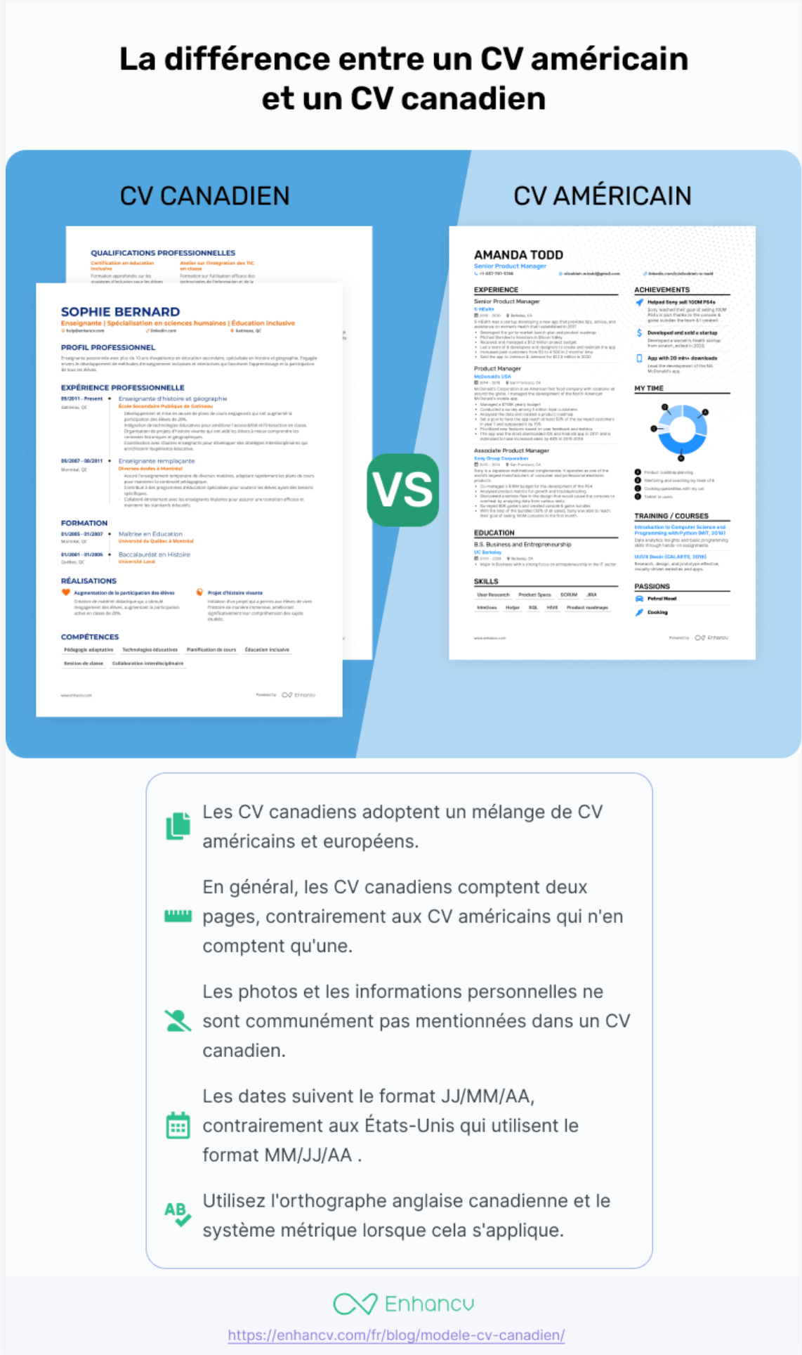 Le CV canadien et le CV américain partagent certaines similitudes, comme l'importance de mettre en avant les compétences et les réalisations. Toutefois, le CV canadien est généralement moins détaillé que son homologue américain, faisant l’impasse sur les informations personnelles trop spécifiques qui sont jugées comme inutiles. Le CV américain compte une page (deux pour le CV canadien) et utilise le format MM/JJ/AA pour les dates.