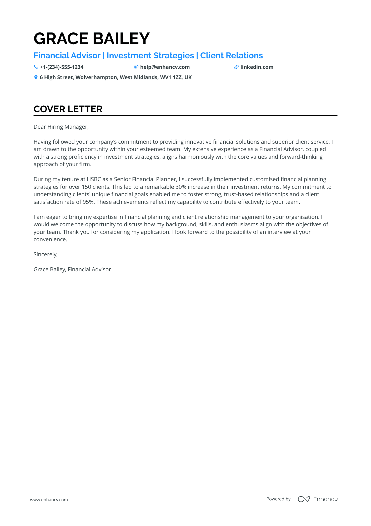 - Create a personalized financial advisor cover letter for each role you apply for, that includes the recruiter's name in the salutation;