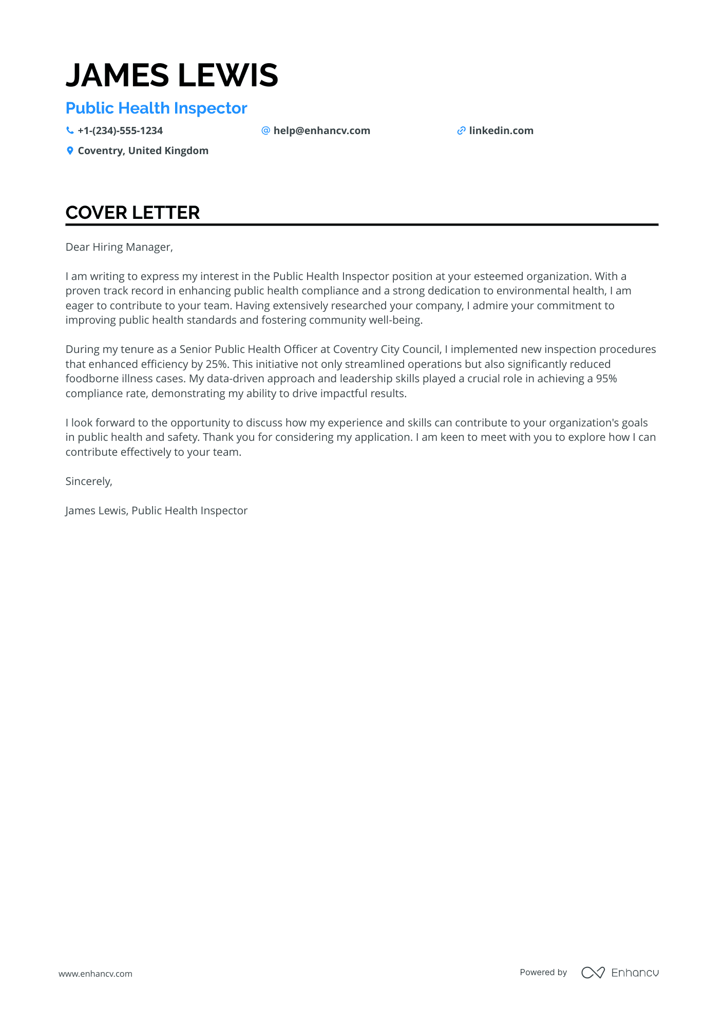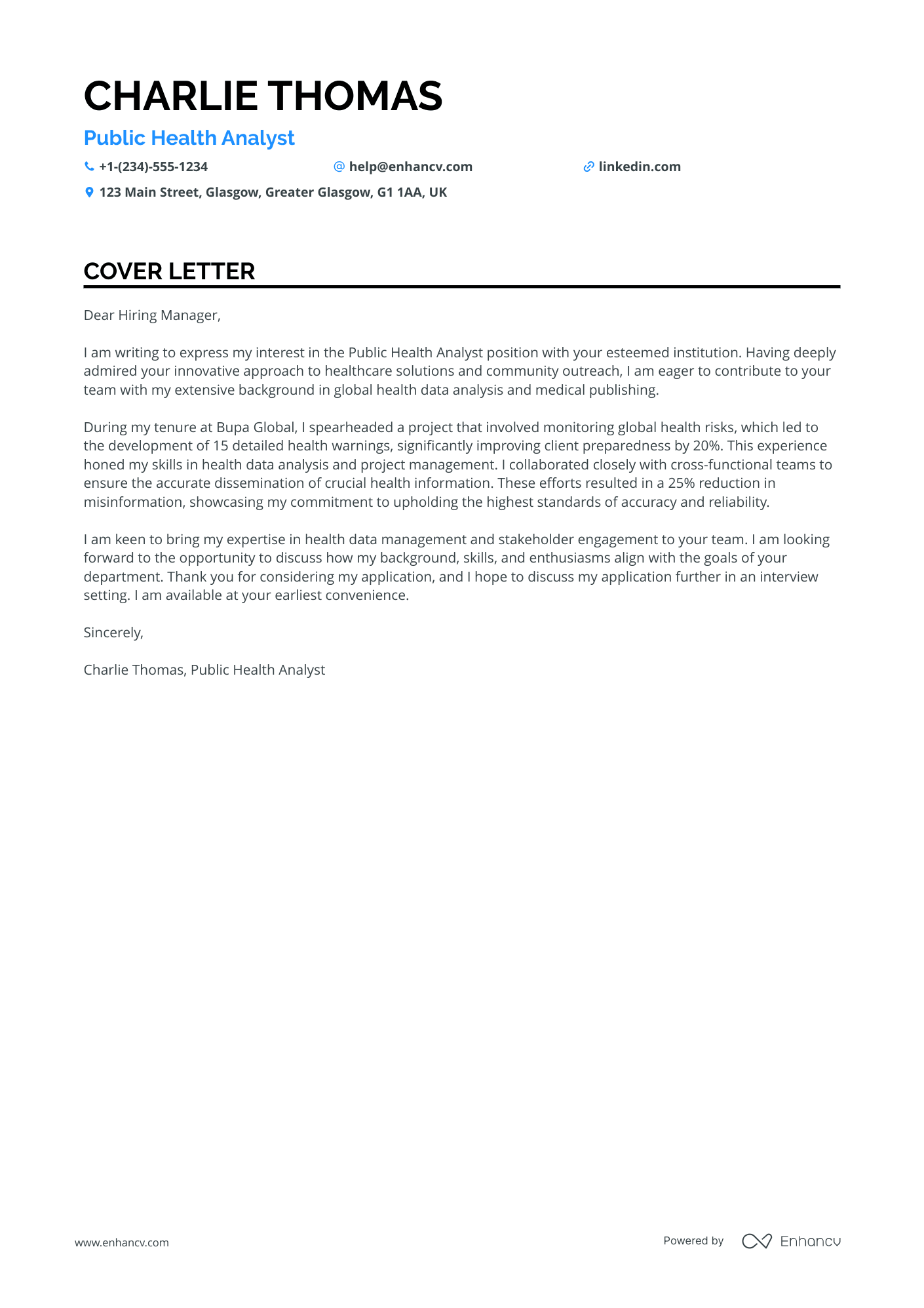 Closing: Finish your cover letter reinforcing your enthusiasm for the role and the value you would bring to the organization, and include a call to action, such as stating your availability for an interview. This leaves the recruiter with a clear sense of your proactive attitude and eagerness to contribute to their public health initiatives.